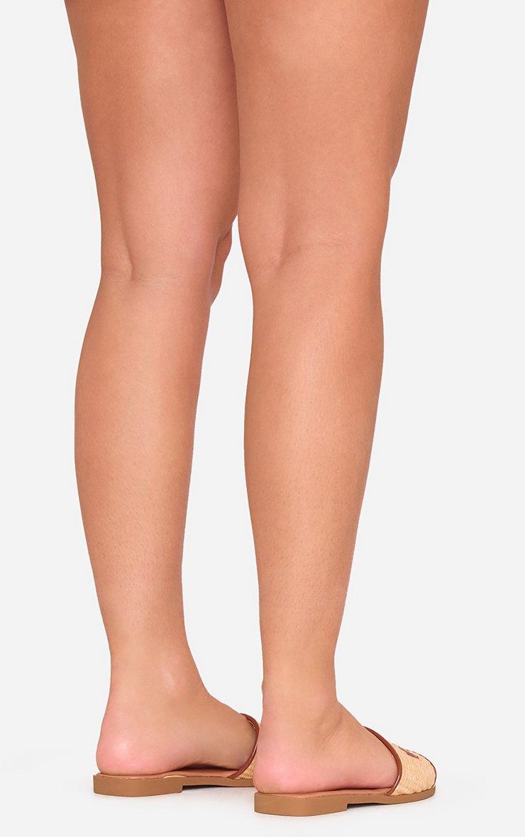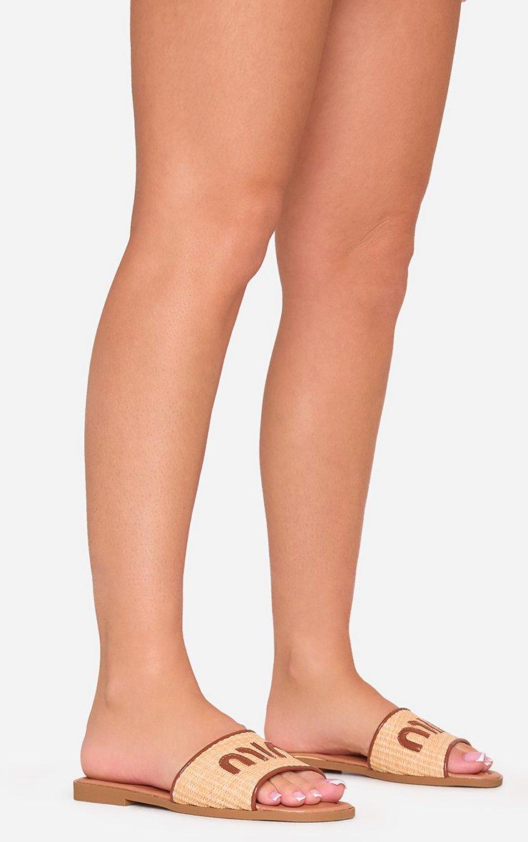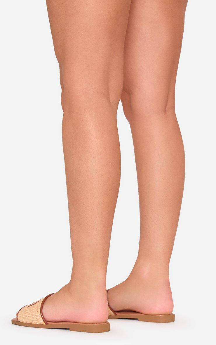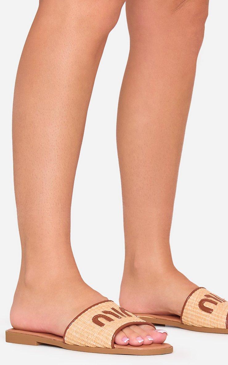 Blaze Logo Woven Detail Flat Slider Sandal In Tan Brown Faux Leather