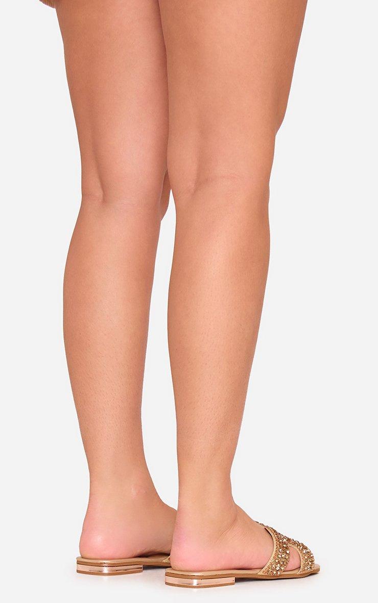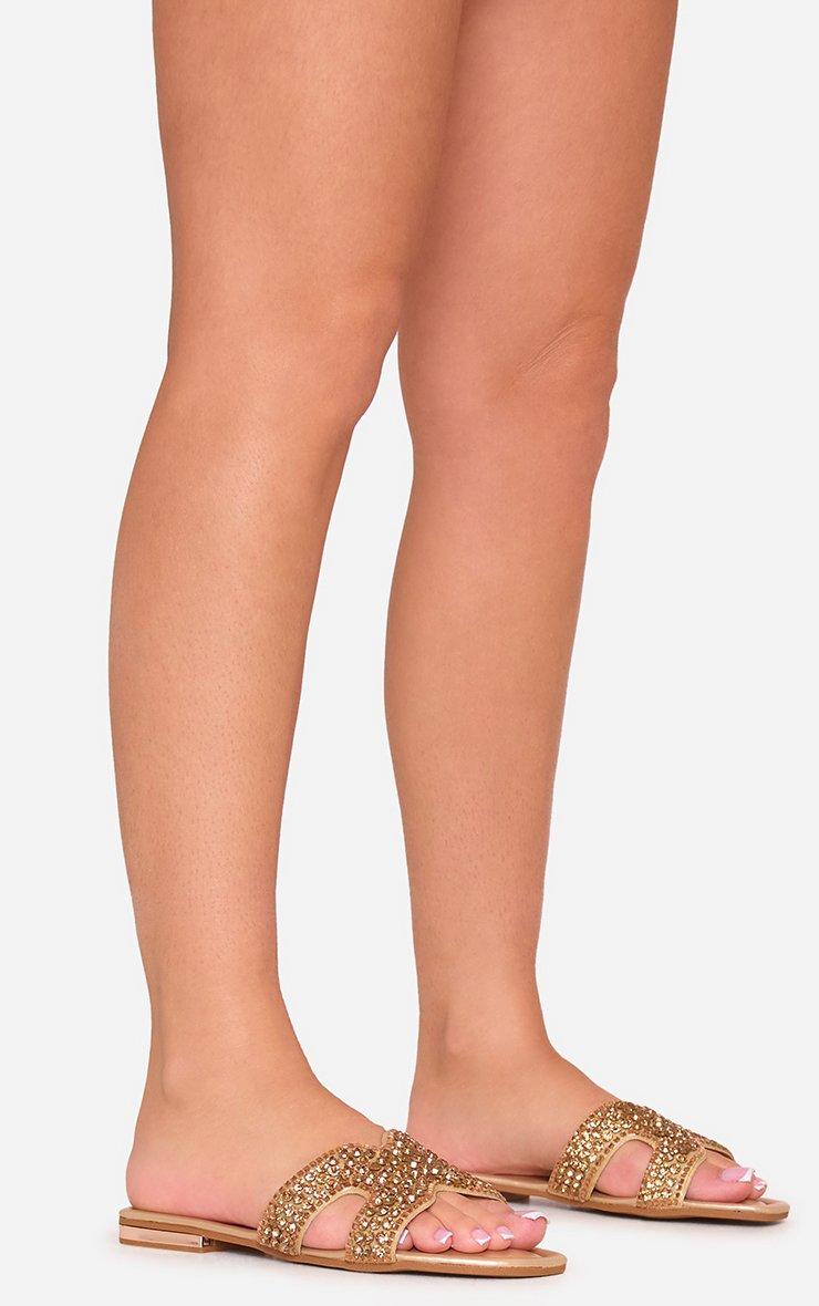 The Effie diamante gladiator strap flat slider sandal in gold faux leather exudes glamour and sophistication. Featuring sparkling diamante detailing and chic gladiator straps, it's the perfect accessory to elevate your look.