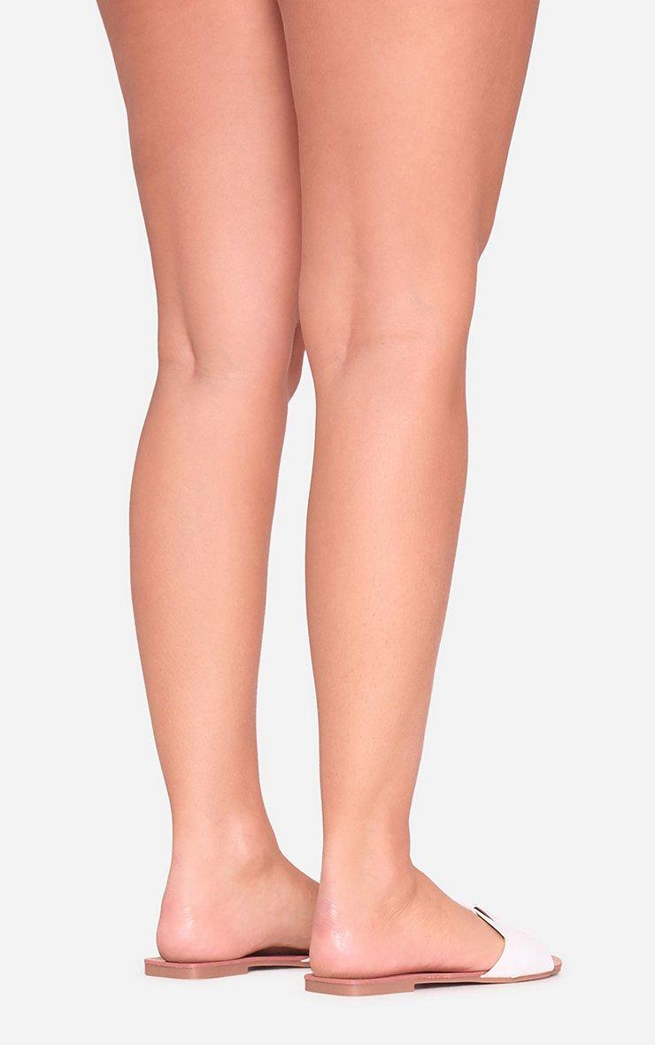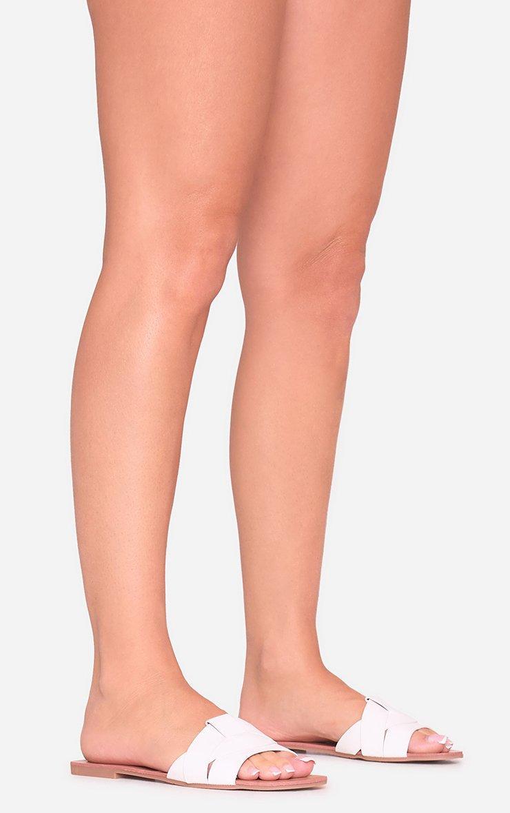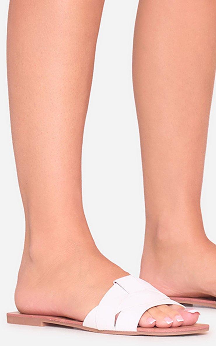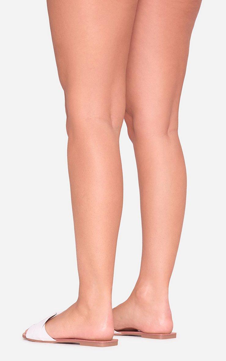 For easy days out or poolside lounging, doll. Featuring white faux leather with woven strap detailing, these flat slider sandals are serving laid-back style with a clean, fresh finish.