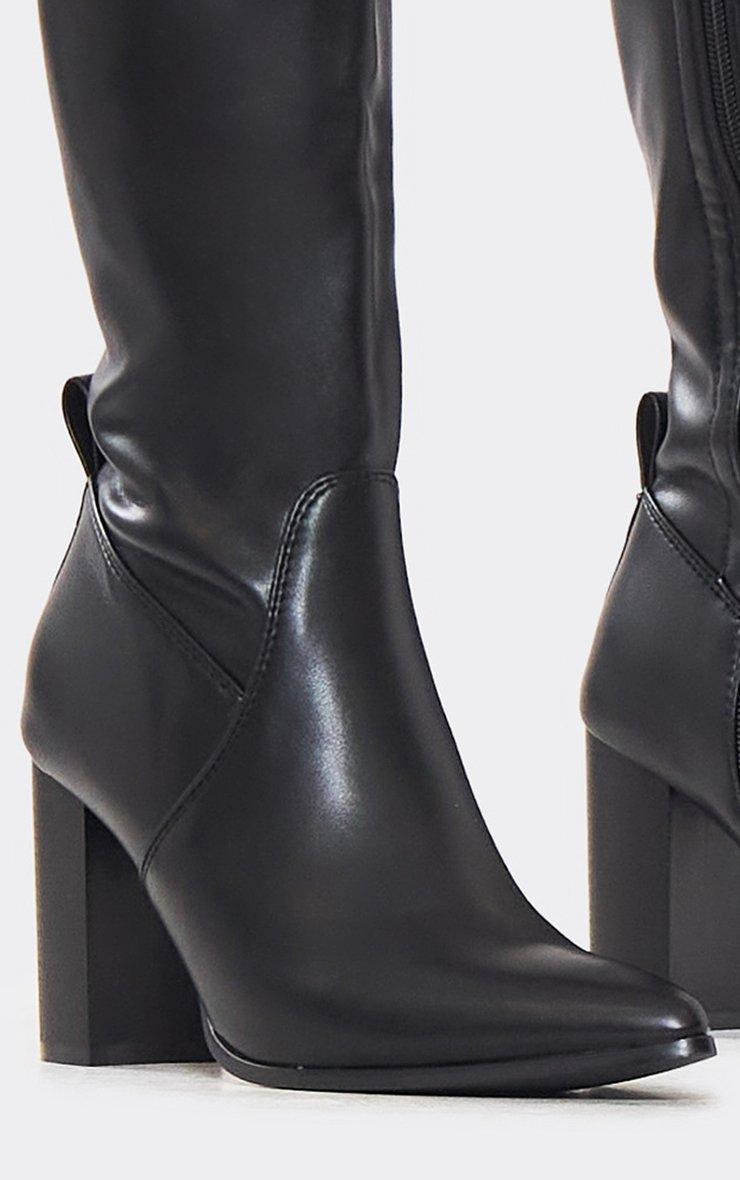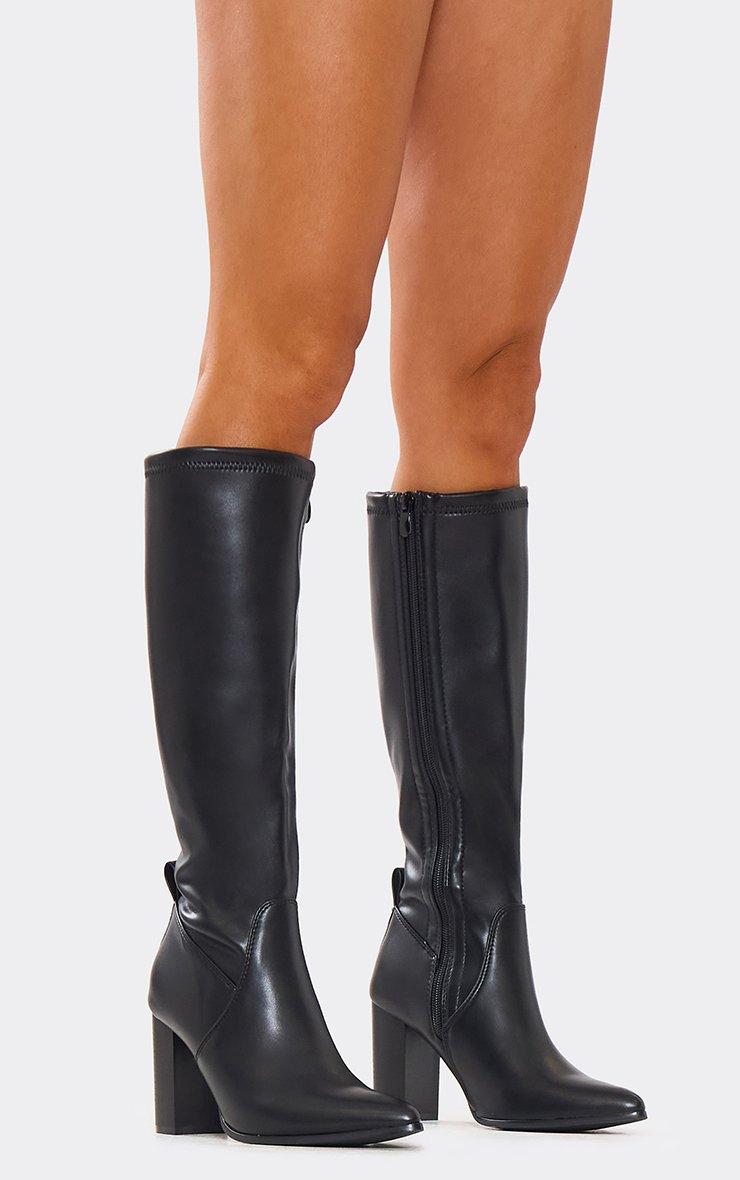 Boo Pointed Toe Block Heel Knee High Long Boot In Black Faux Leather