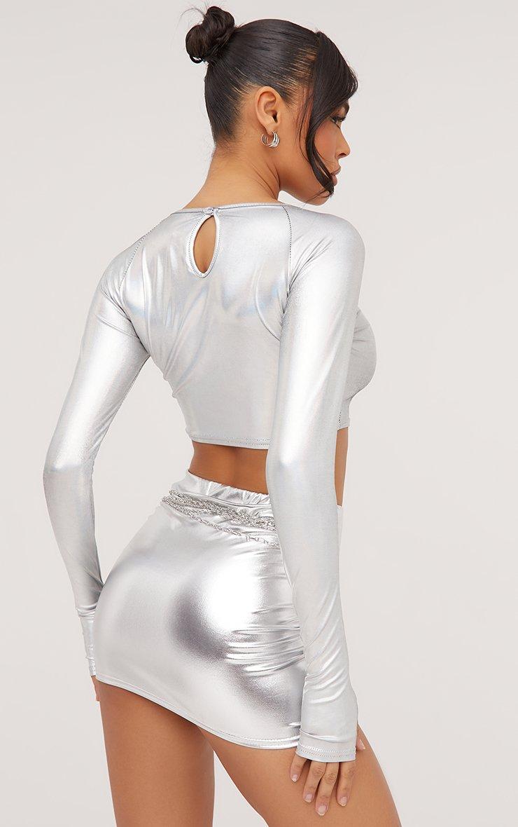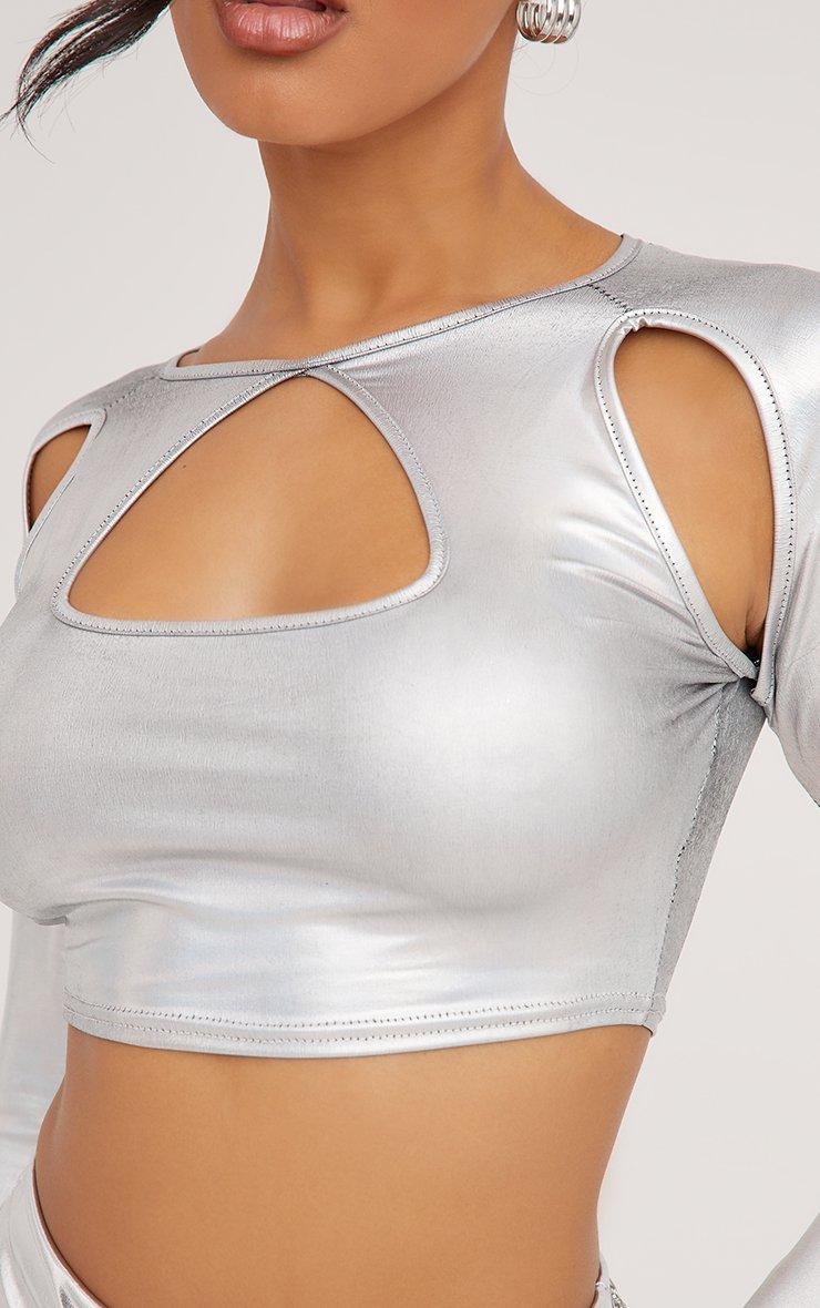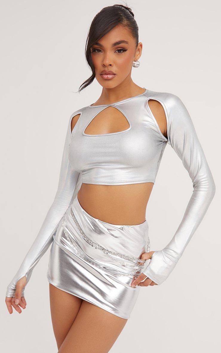Long Sleeve Keyhole Cut Out Detail Crop Top In Silver Metallic