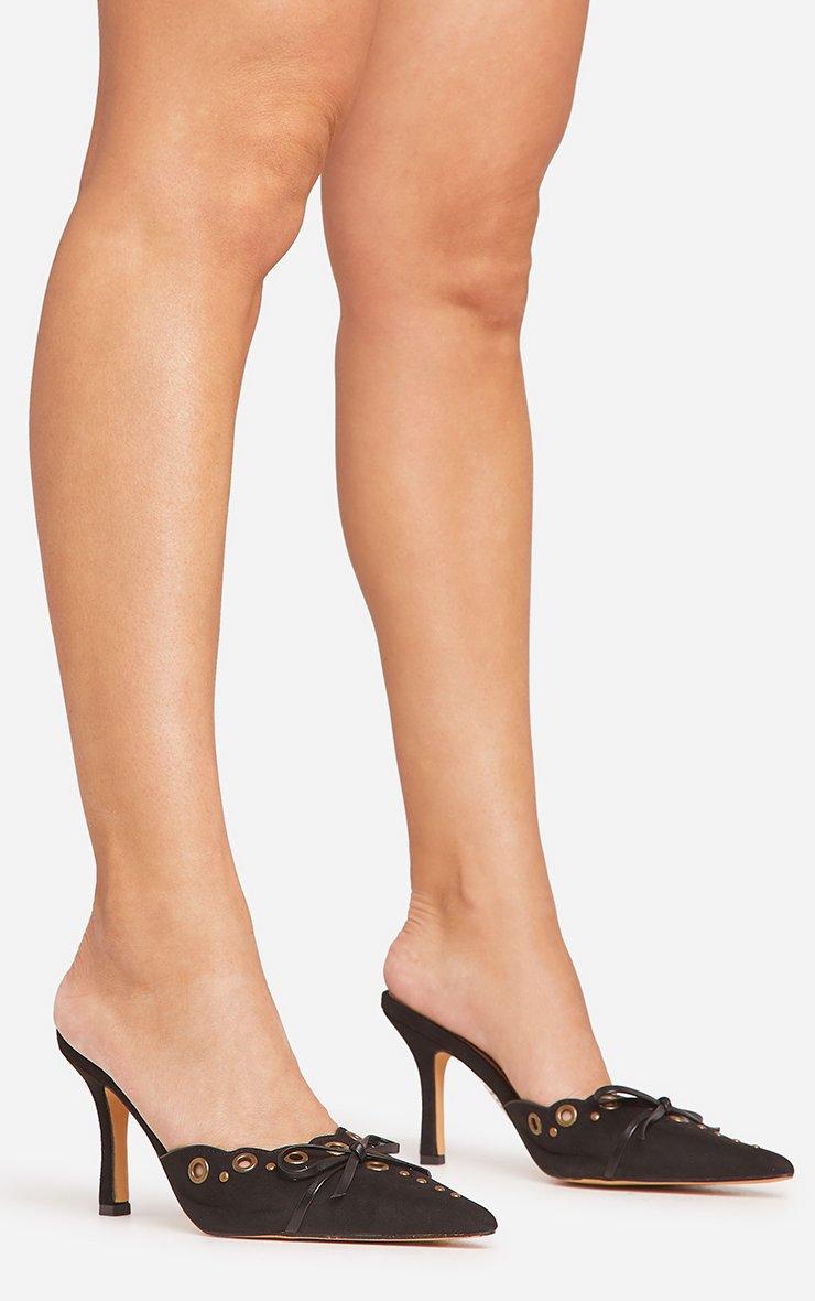 Complete your look with these mules girl. Featuring a black faux suede material, an eyelet detail, a pointed toe and a court heel design.