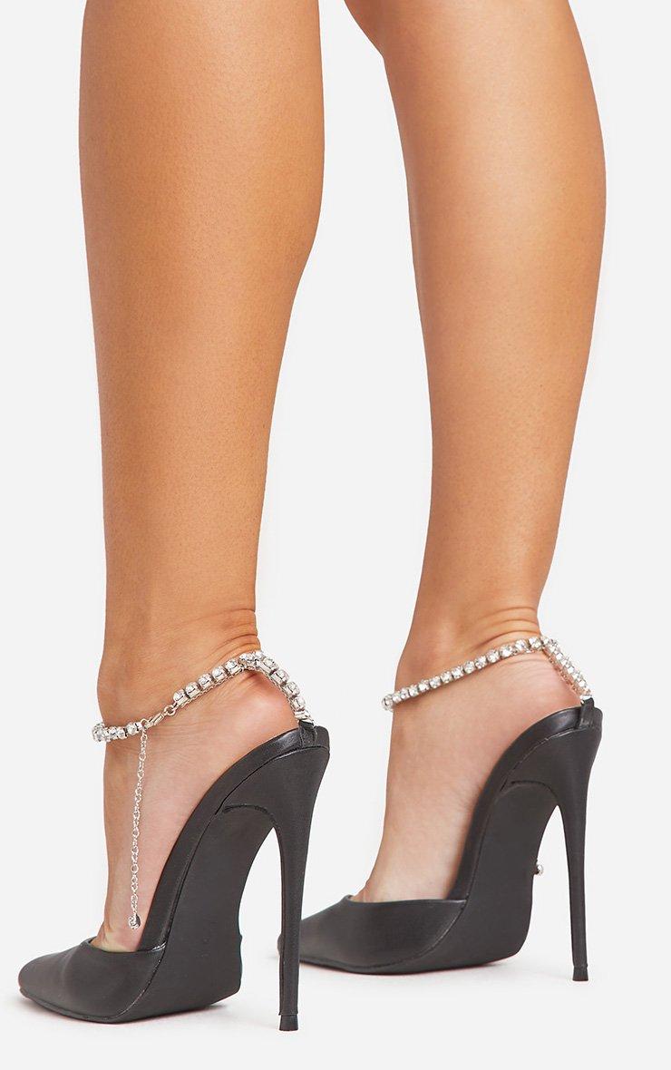 Tilly Diamante Detail Ankle Strap Pointed Toe Stiletto Court Heel In Black Faux Leather
