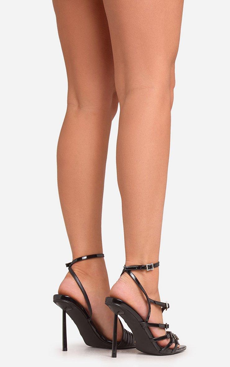 Amp up your look with our Coven Multi Diamante Buckle Strap Detail Pointed Toe Stiletto Heel In Black Patent. These black strappy stiletto heels serve subtle sparkle with multiple diamante buckles and a sleek pointed toe. Crafted in black patent, these stiletto heels will have you strutting with confidence!