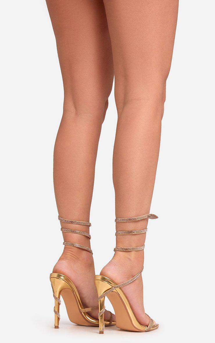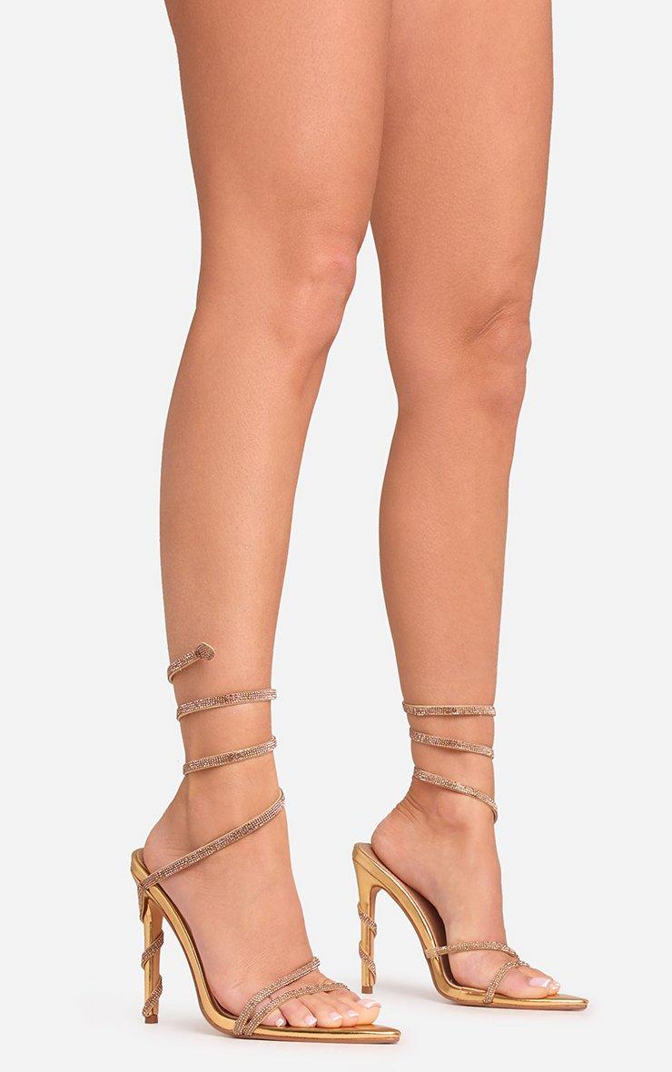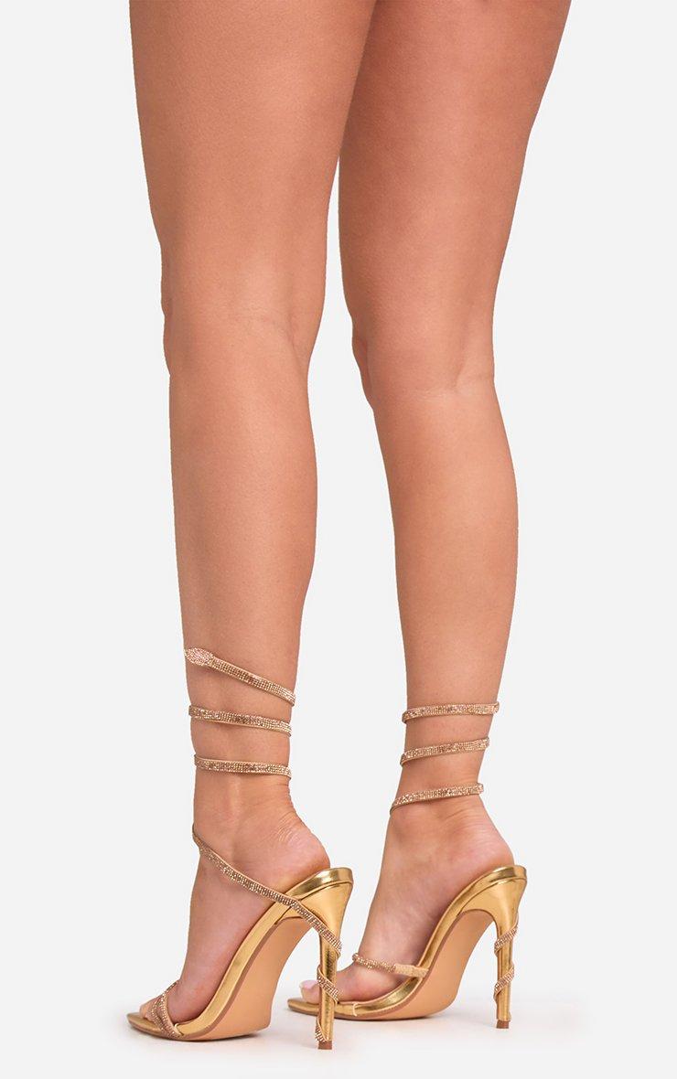 Step into pure elegance, doll! Featuring a gold faux leather material with sparkling diamante detailing and a wrap-around strap, these pointed toe stiletto heels bring luxe, show-stopping vibes to any outfit.