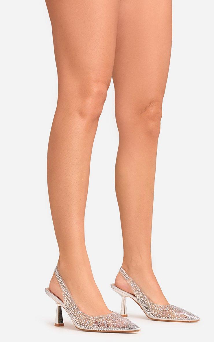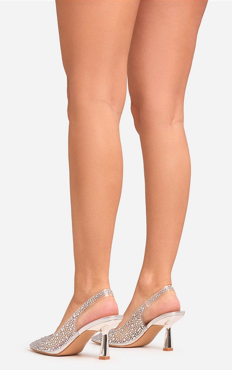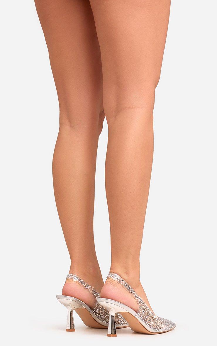 Sparkle all night in our Raf Diamante Detail Pointed Perspex Toe Slingback Court Heel In Silver Faux Leather. These silver diamante heels are weekend-ready with their diamante details, pointed Perspex toe and sleek court style. In a silver faux leather, these slingback heels are dripping in luxe vibes!