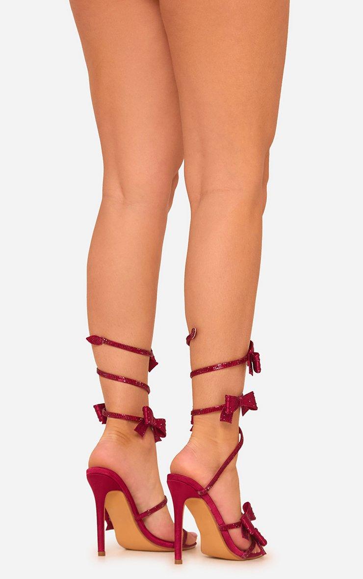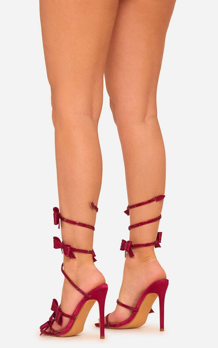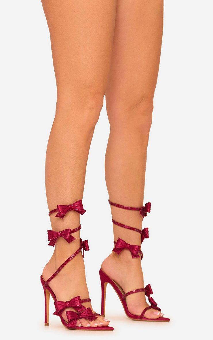 Piece-Of-Me Diamante Bow Detail Wrap Around Strap Pointed Toe Stiletto Heel In Burgundy Satin