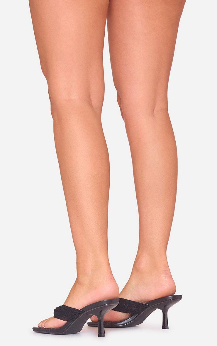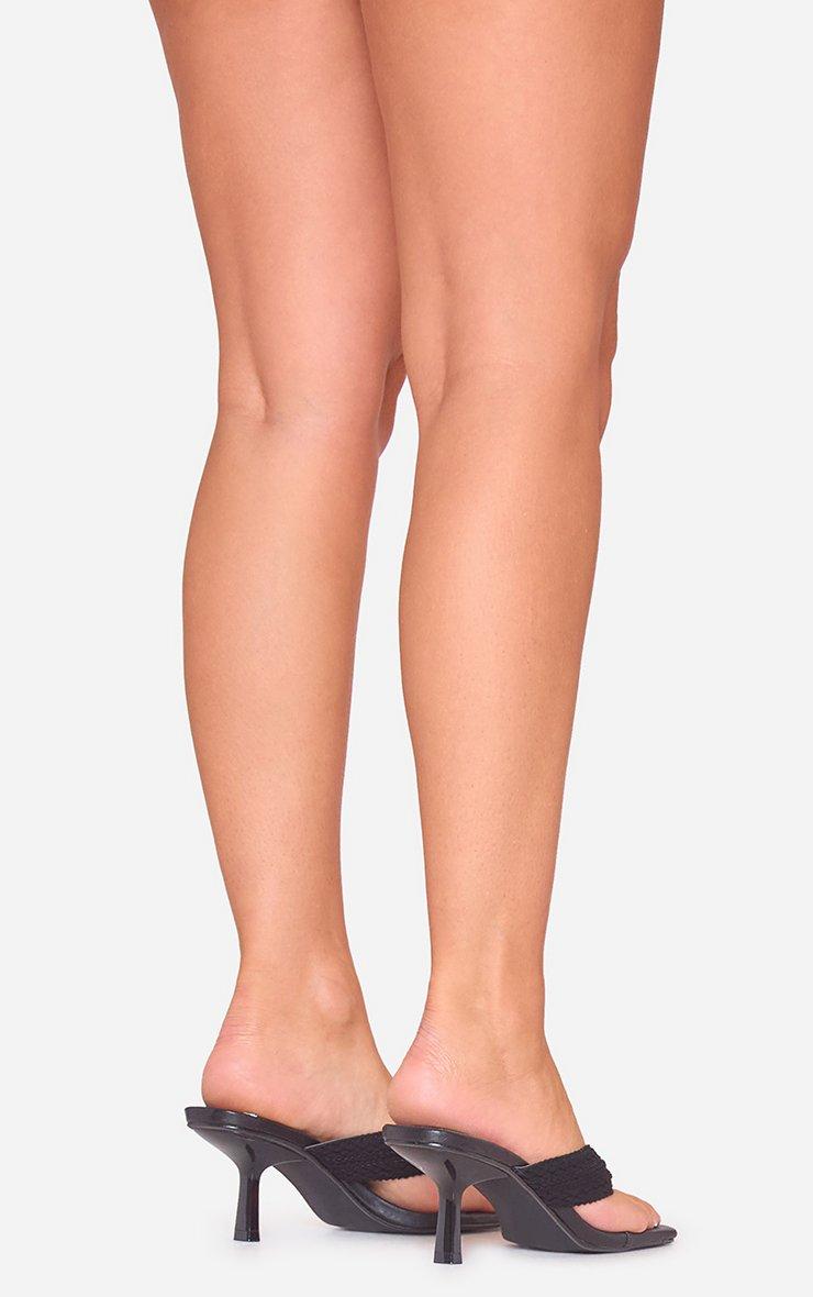 Turn heads with the Hudson black patent mules, featuring a textured thong strap and sharp square toe. Effortlessly chic, these heels are your go-to for adding a bold edge to any outfit.