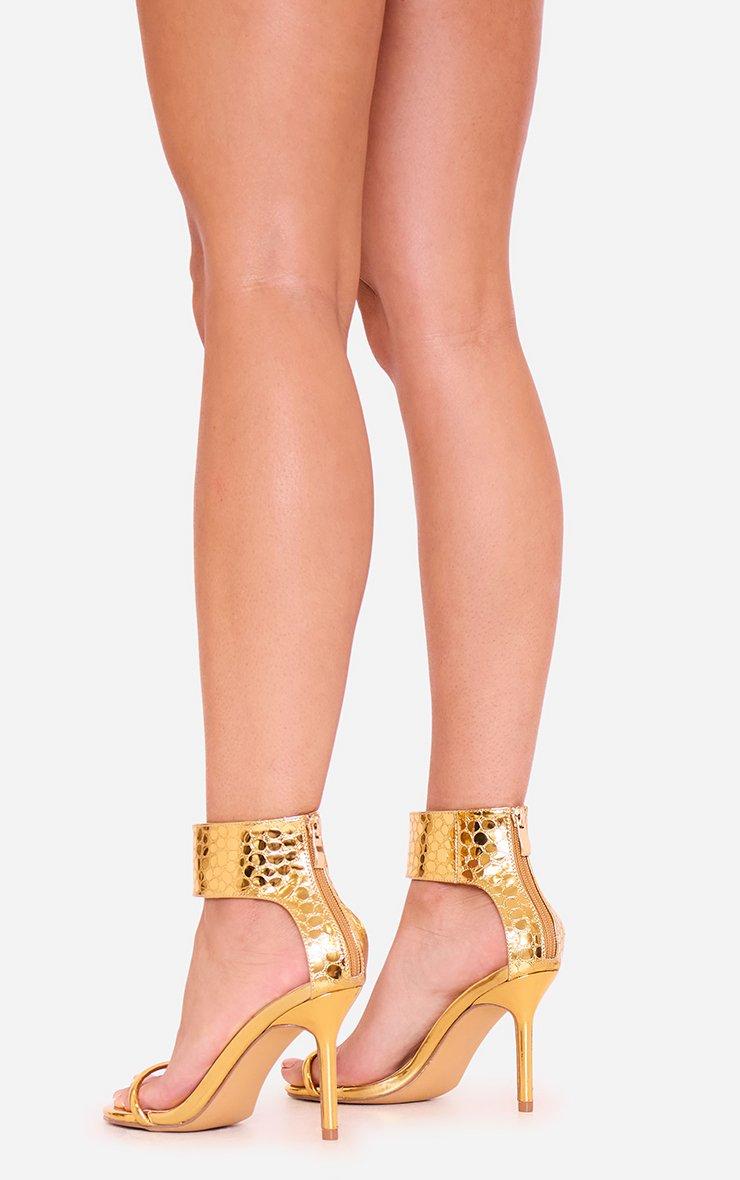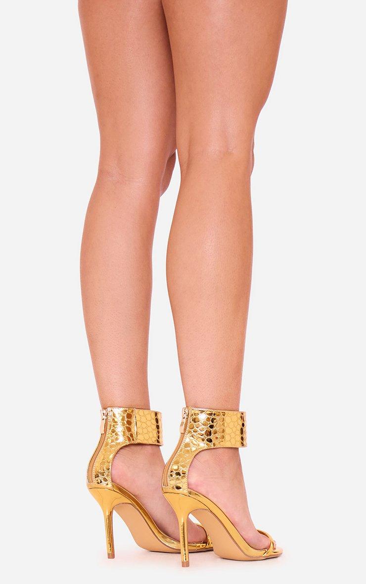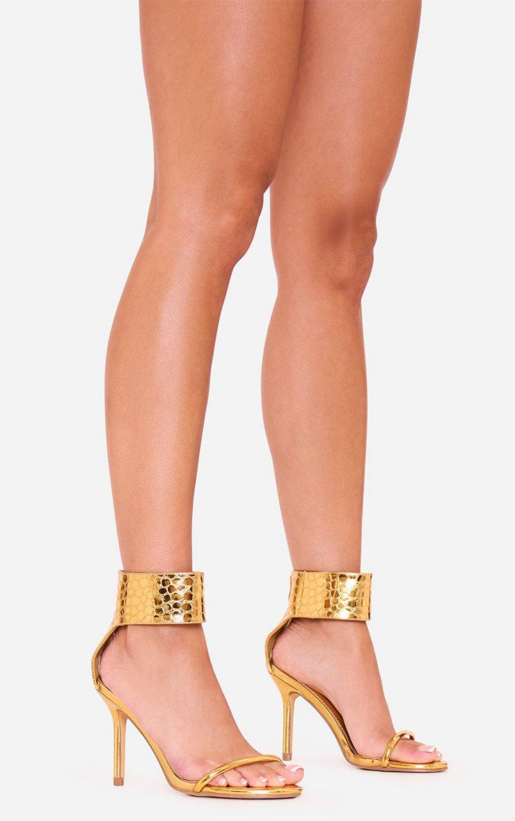 In-Awe Thick Ankle Strap Stiletto Heel In Gold Metallic Croc Print Faux Leather