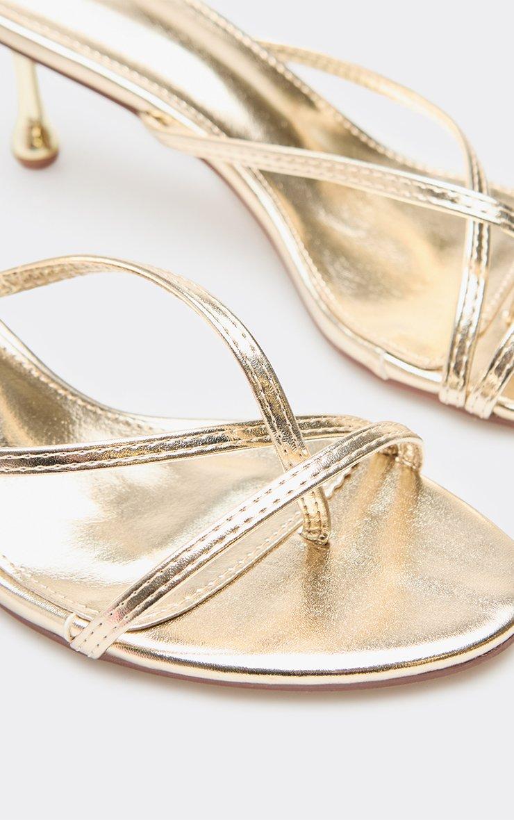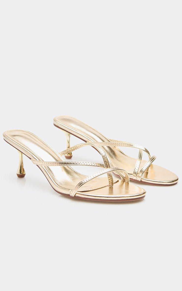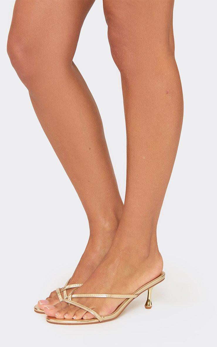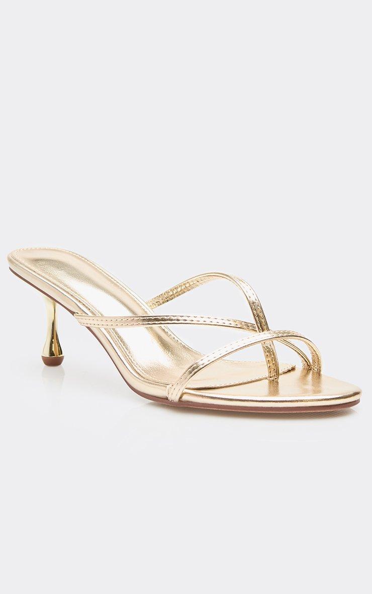 Glow at your next big event in these head-turning heels. Featuring gold faux leather material with strappy thong detailing, these kitten heels are pure main character energy. Style with a white mini dress and gold jewellery for a luxe, high-end look.