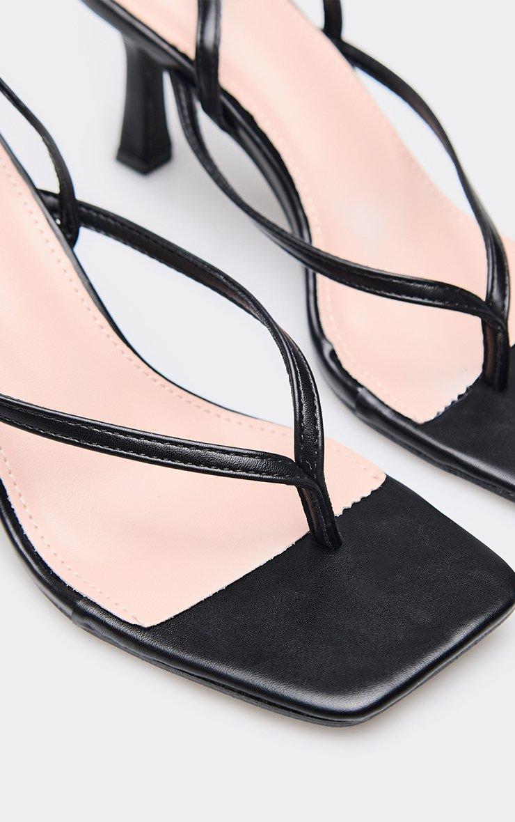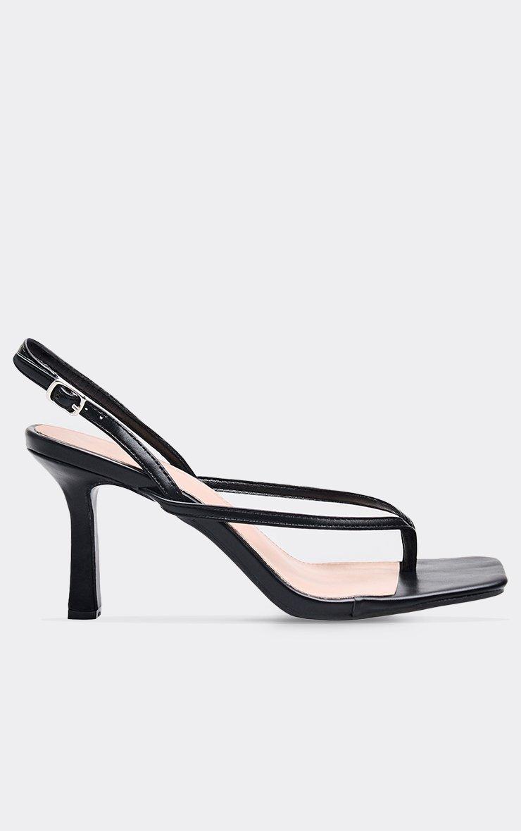 A total 90s-inspired flex, doll. Featuring black faux leather material with a sharp thong strap, a sleek square toe, and a chic slingback design, these heels are a total win. Style with straight-leg blue jeans and a cropped white shirt for a sharp, off-duty aesthetic.