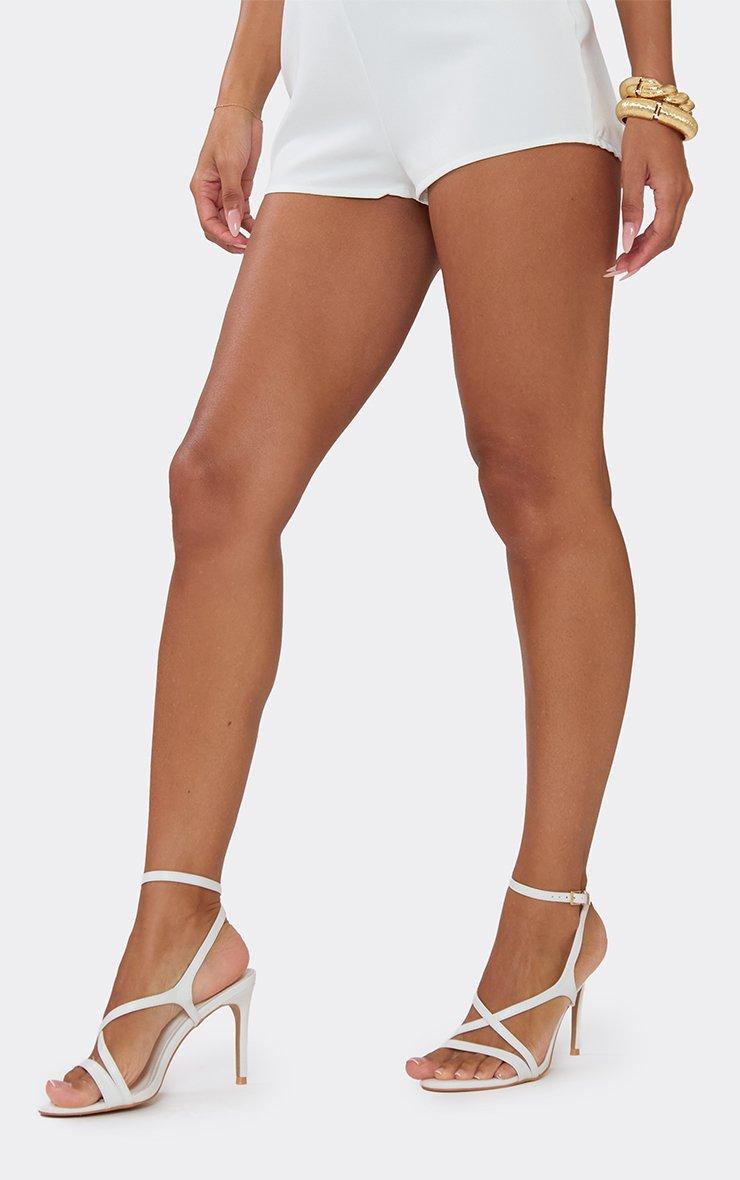 Refresh your holiday shoe game with these must-have heels. Featuring white faux leather material with cross strap and stiletto heel detailing. Style with a bright mini dress and a matching bag for an effortless it-girl vibe.