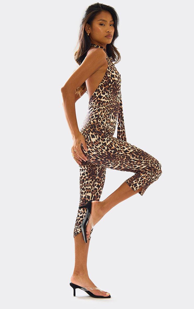 Bold vibes, doll, featuring a brown leopard print stretch material with scarf and open back detailing, this capri jumpsuit brings chic, playful energy to your look.