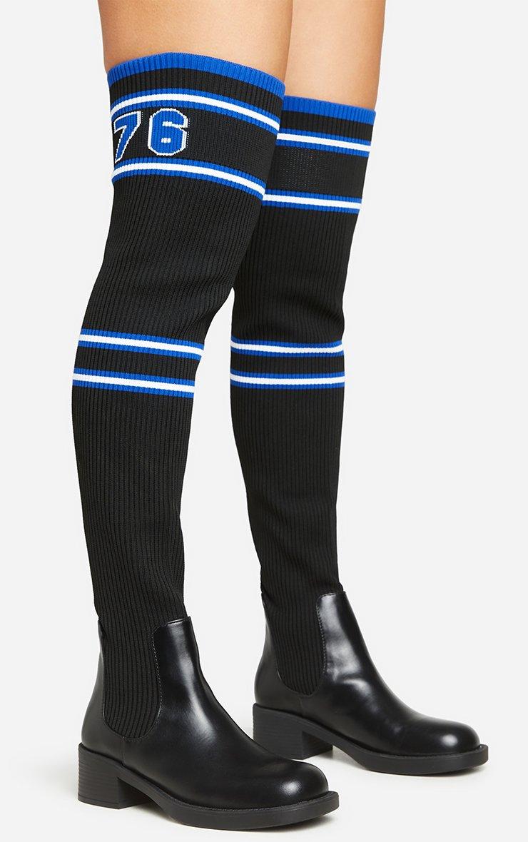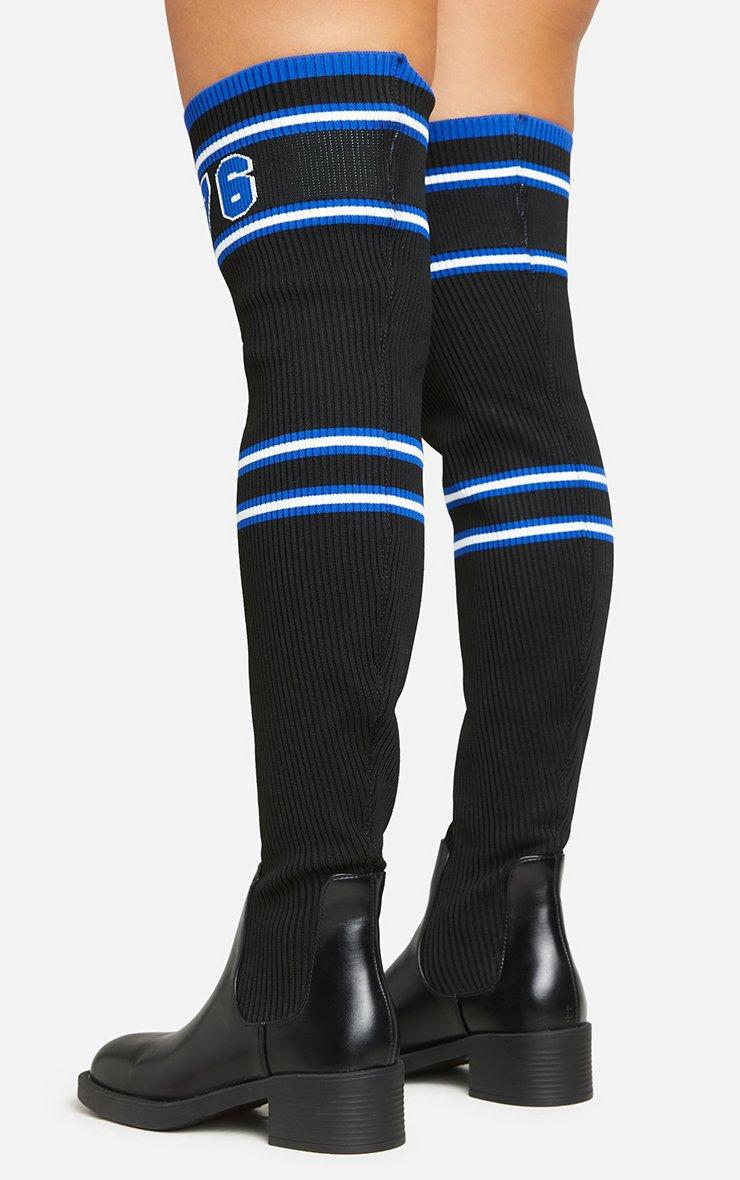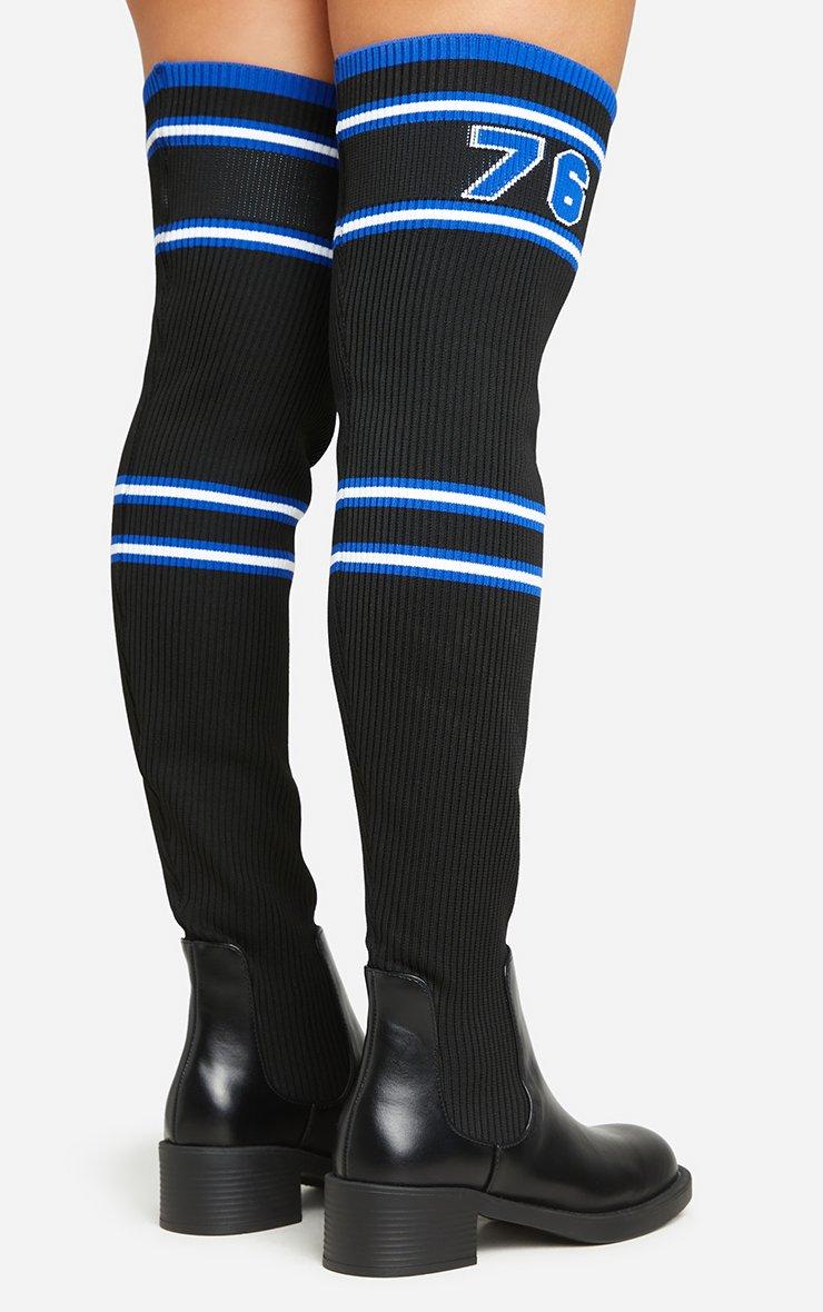 Rev-It-Up Motocross Detail Over The Knee Thigh High Long Boot In Black And Blue Knit
