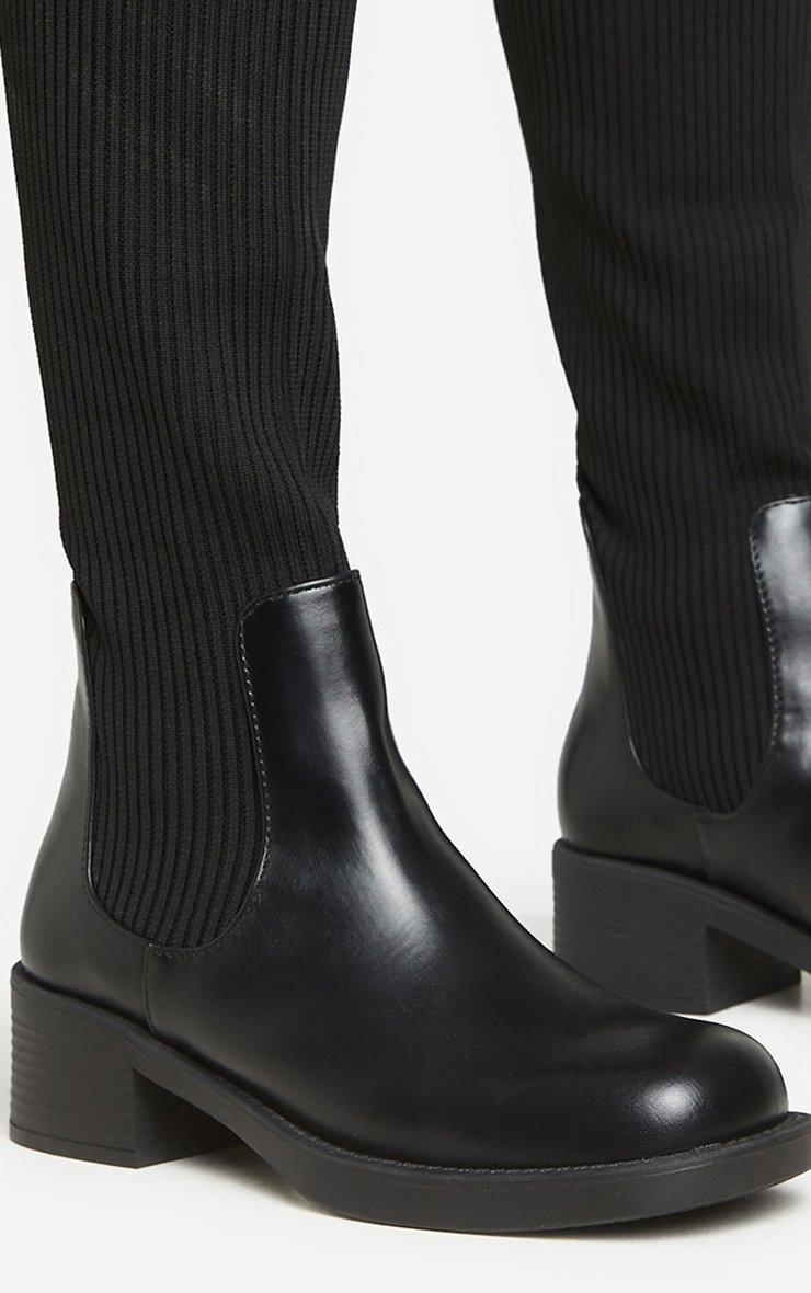 Grunge down your going out look with these new season boots doll. Featuring a black and blue knitted material, with motocross detailing, a chunky sole and an over the knee thigh high length.