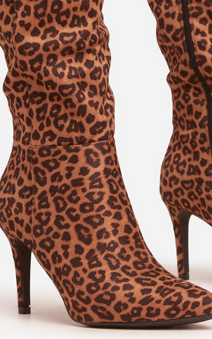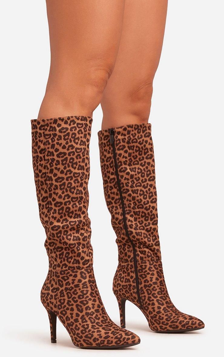 Avery Pointed Toe Stiletto Heel Knee High Long Boot In Leopard Print Faux Suede