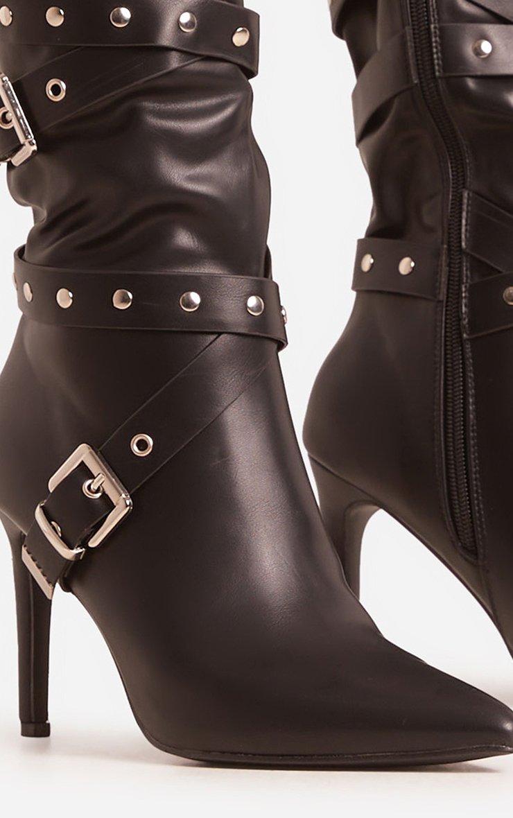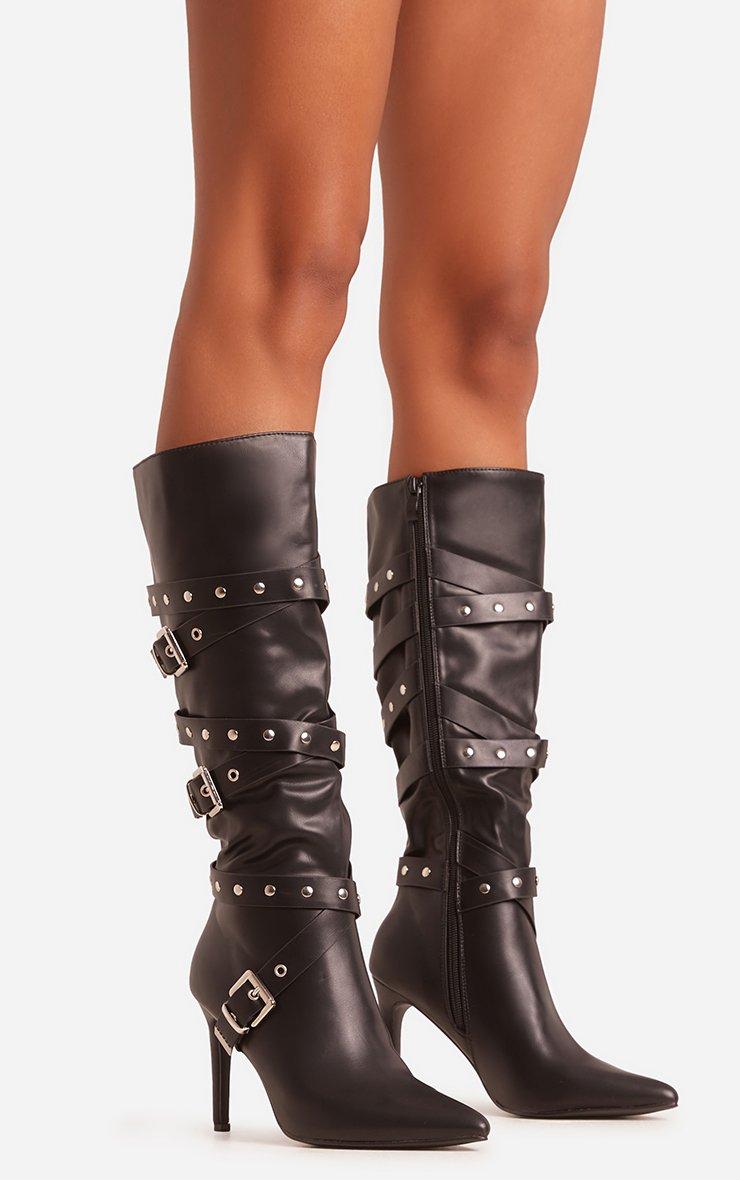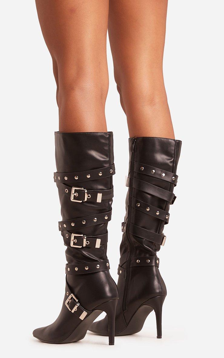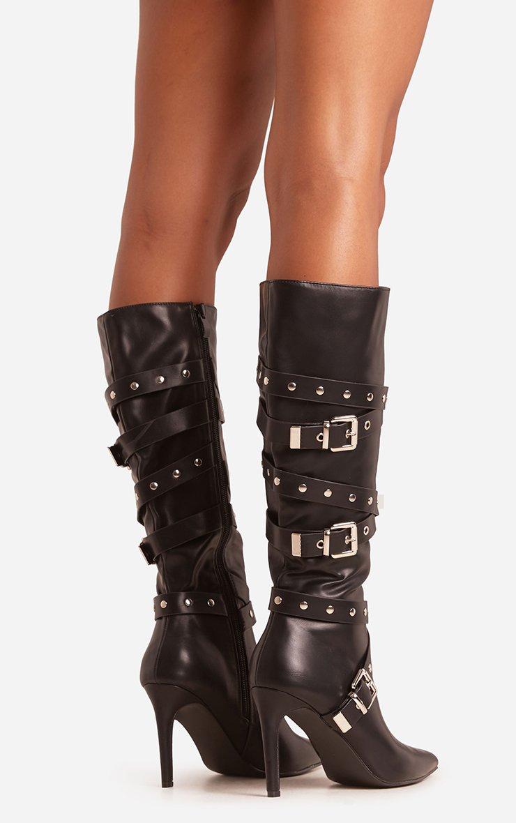Zev Buckle Studded Strap Detail Pointed Toe Stiletto Heel Knee High Long Boot In Black Faux Leather