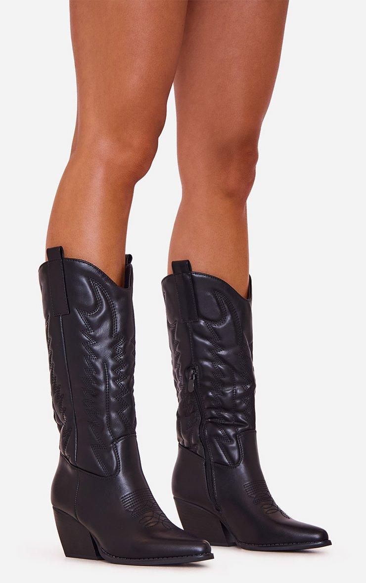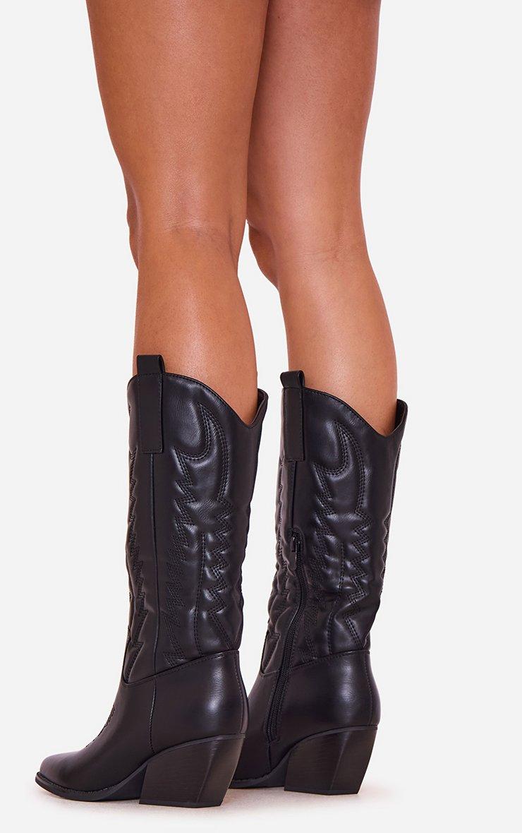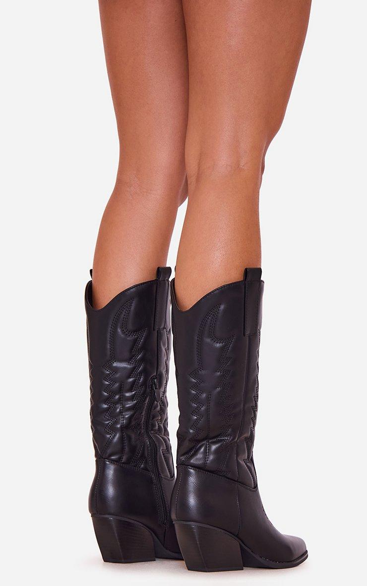 Bobbi Embroidered Detail Pointed Toe Mid Calf Western Cowboy Boot In Black Faux Leather