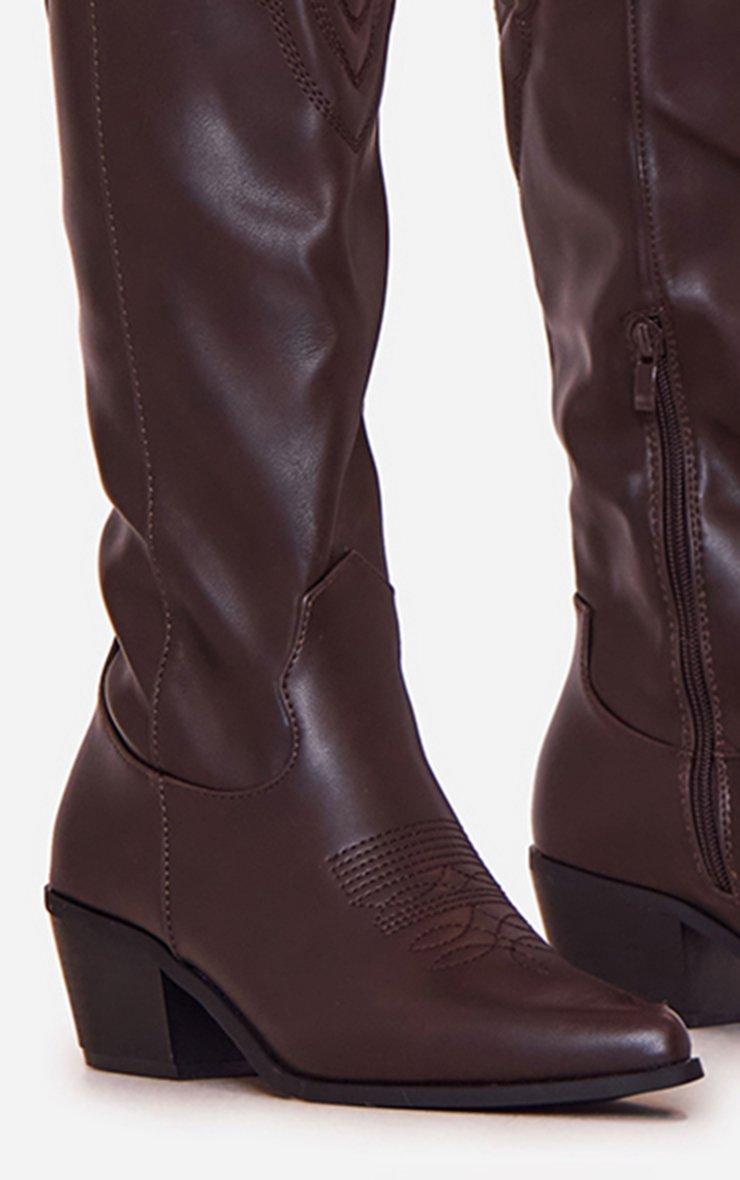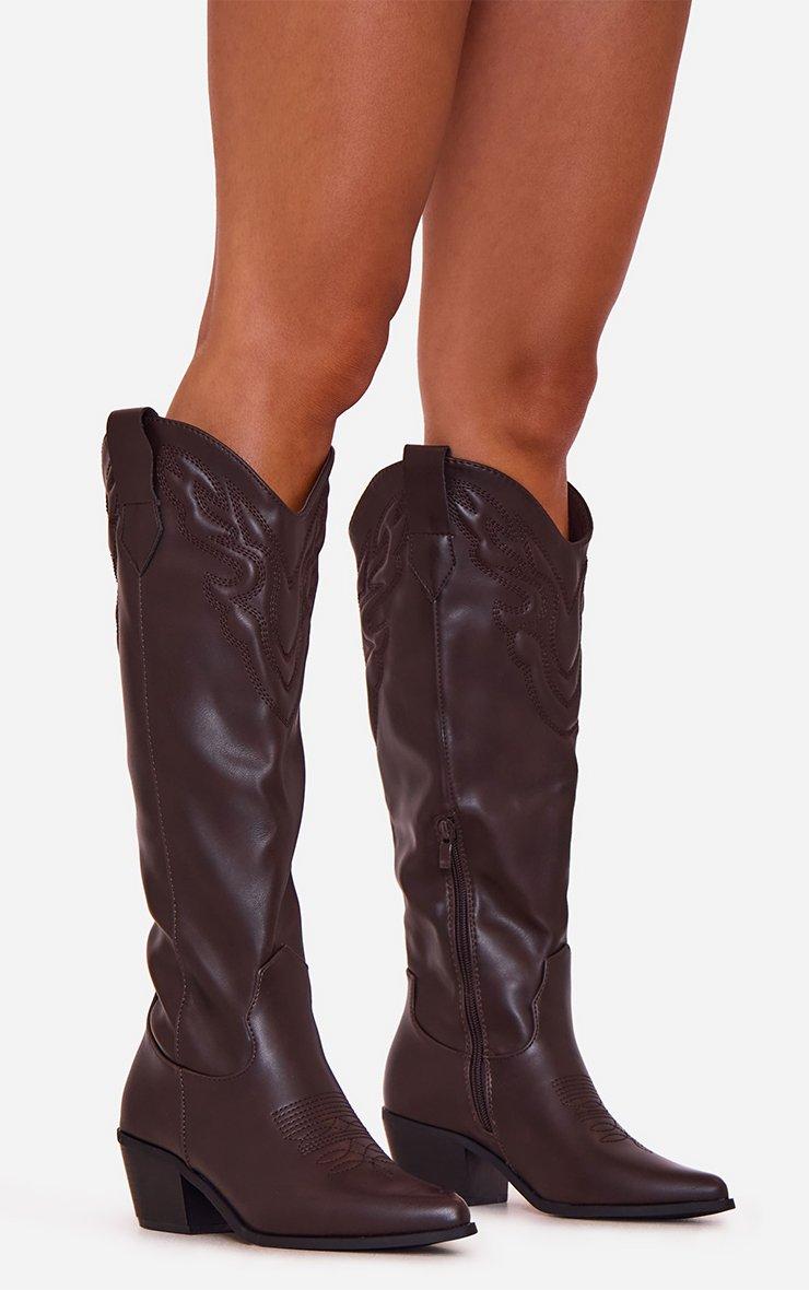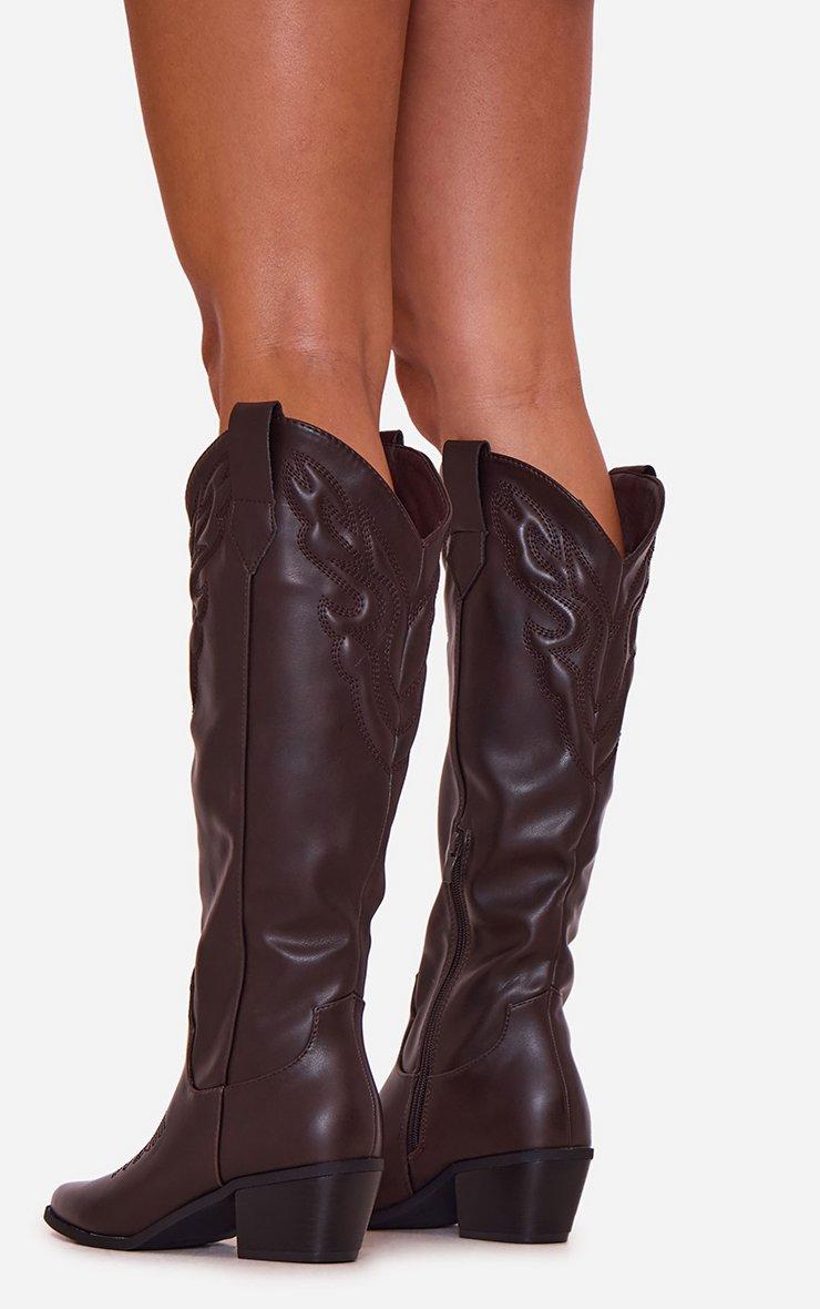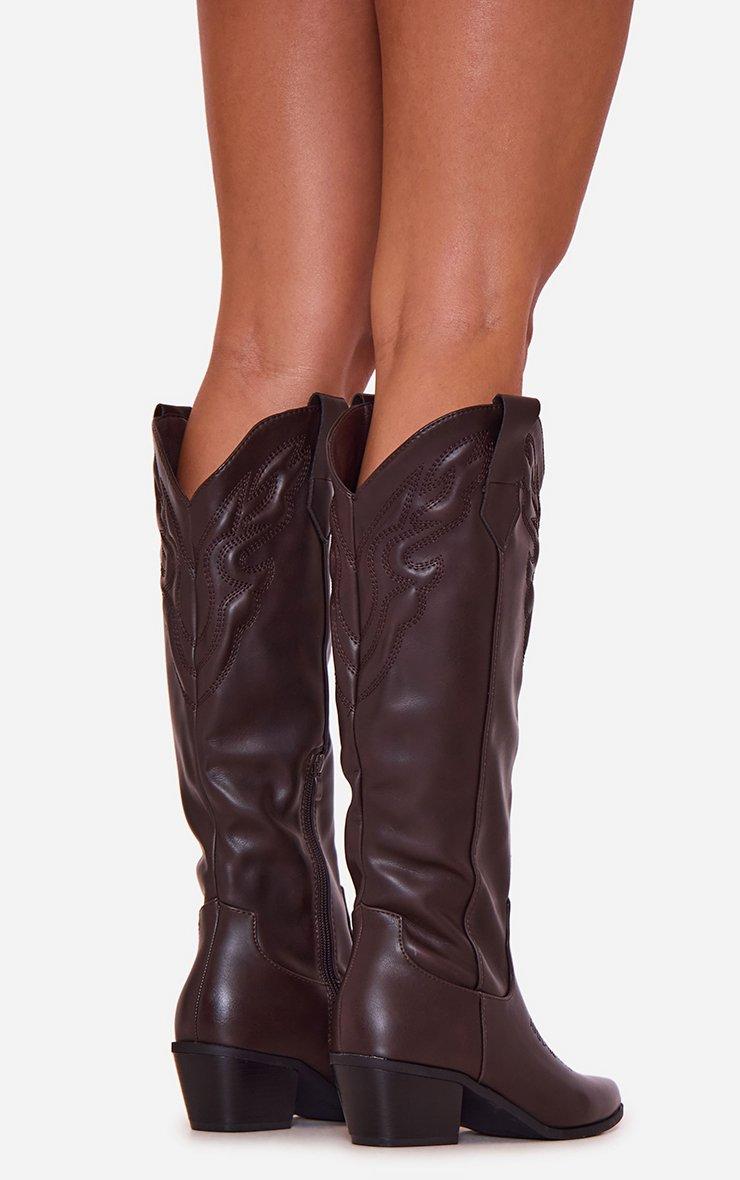 Tyler Embroidered Detail Pointed Toe Mid Calf Western Cowboy Boot In Brown Faux Leather