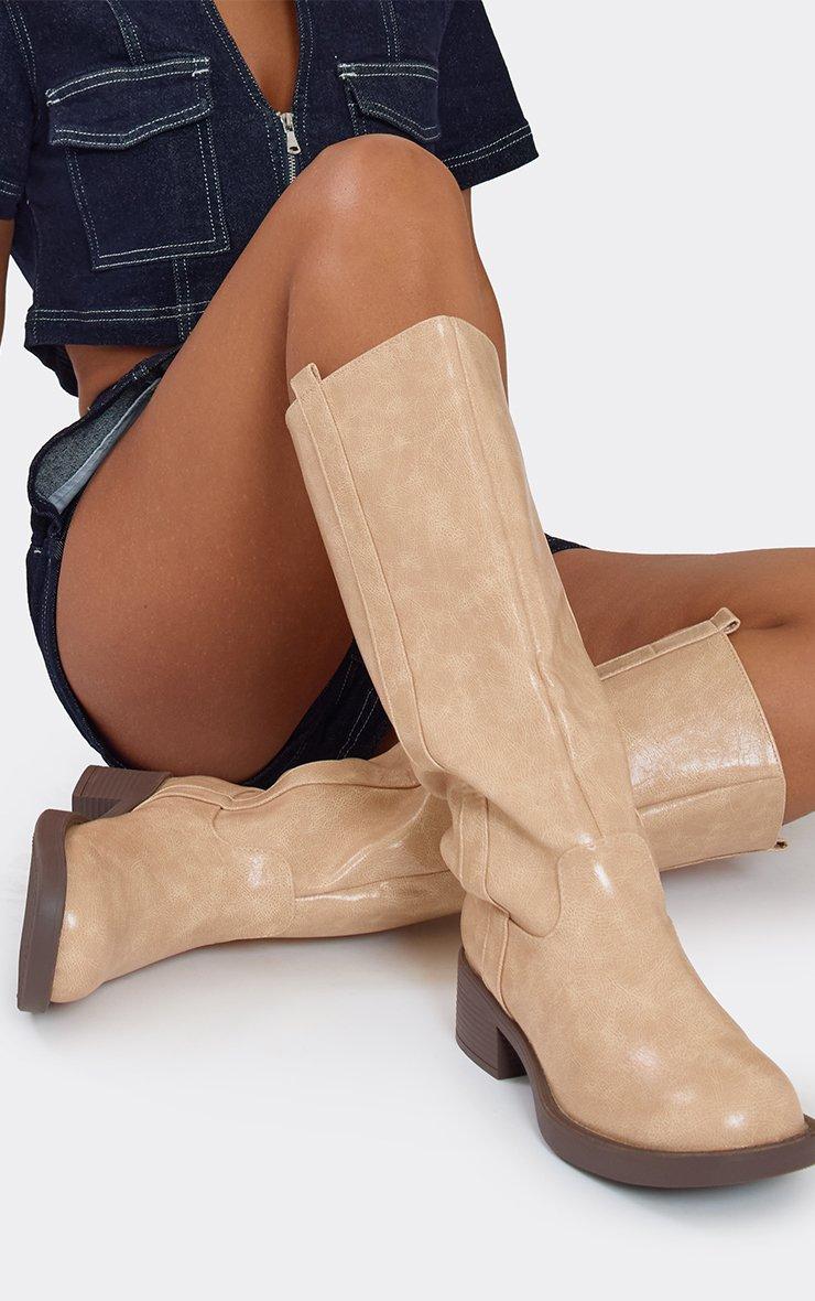 Festival ready, doll. Featuring a distressed nude faux leather material with knee high and long biker detailing, these boots are serving chic, bold vibes for a statement look.