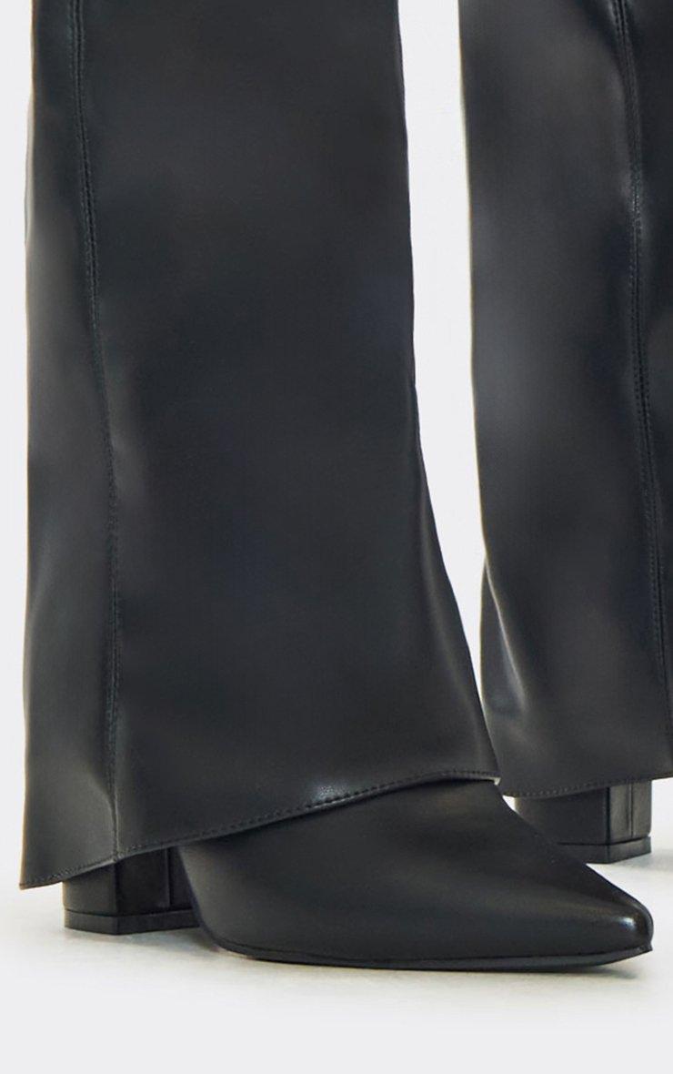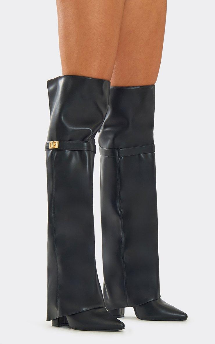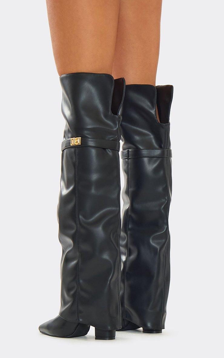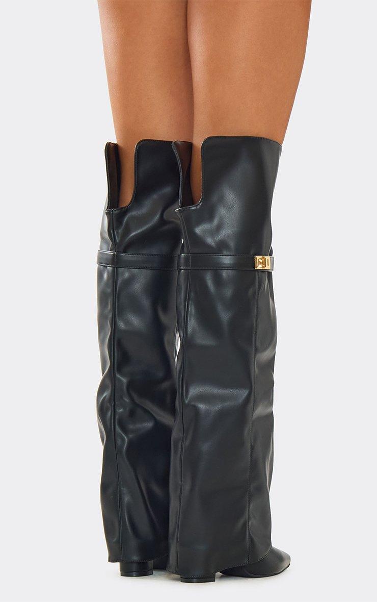Kiki Lock Detail Pointed Toe Over The Knee Thigh High Long Boot In Black Faux Leather