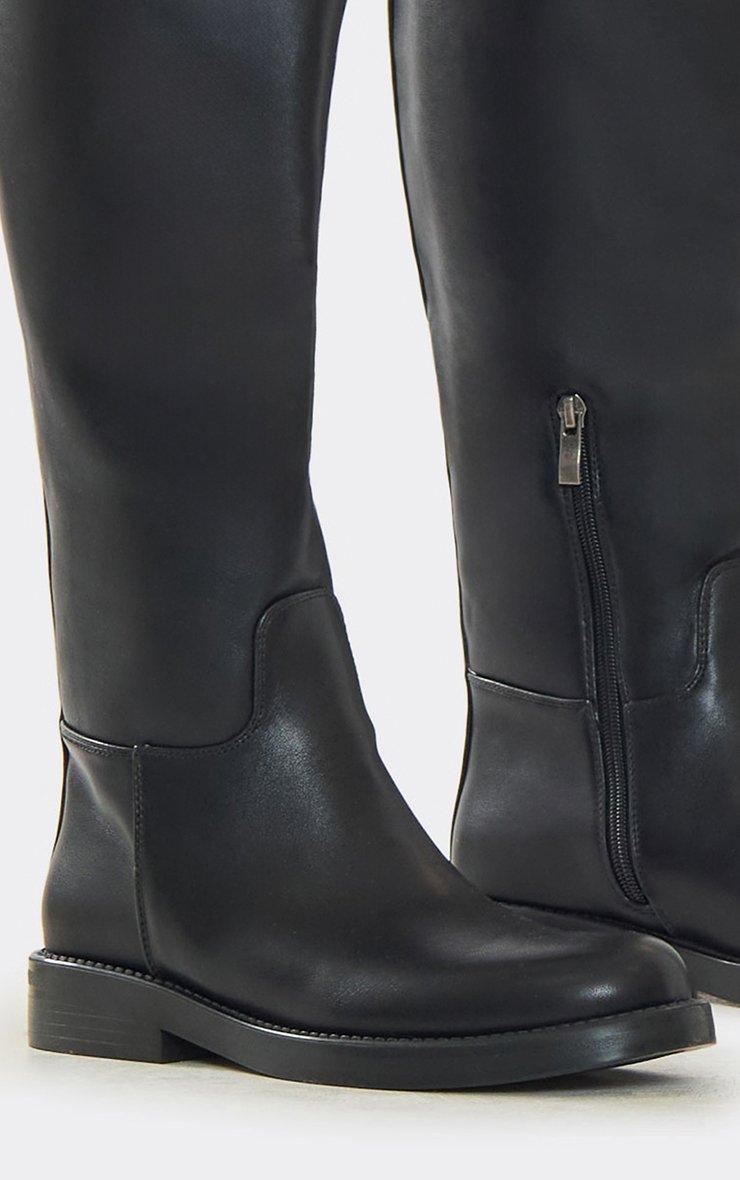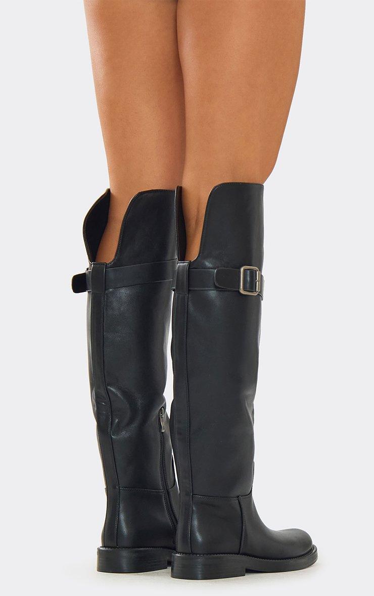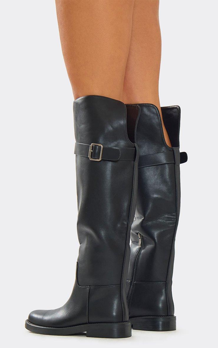 Maura Buckle Detail Over The Knee Thigh High Long Boot In Black Faux Leather
