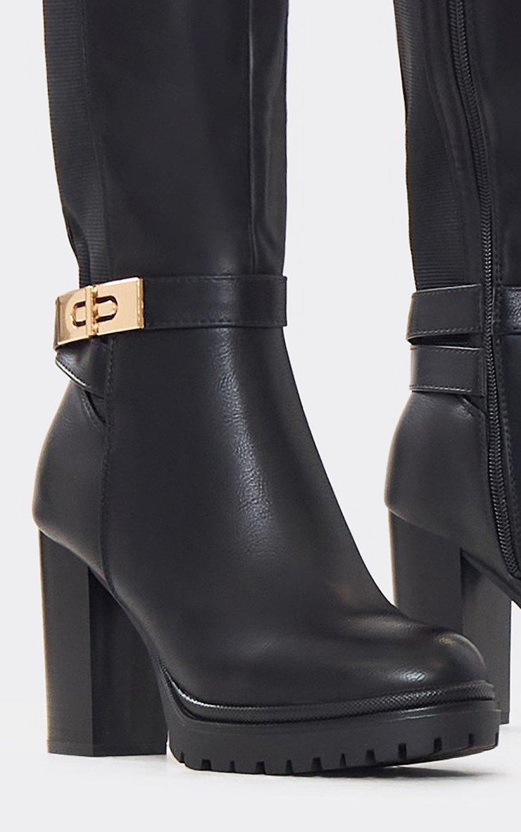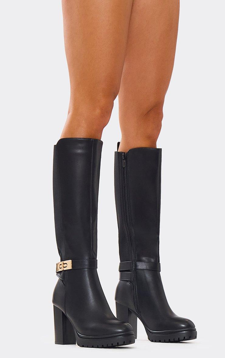 Kalia Lock Detail Block Heel Knee High Boot In Black Faux Leather