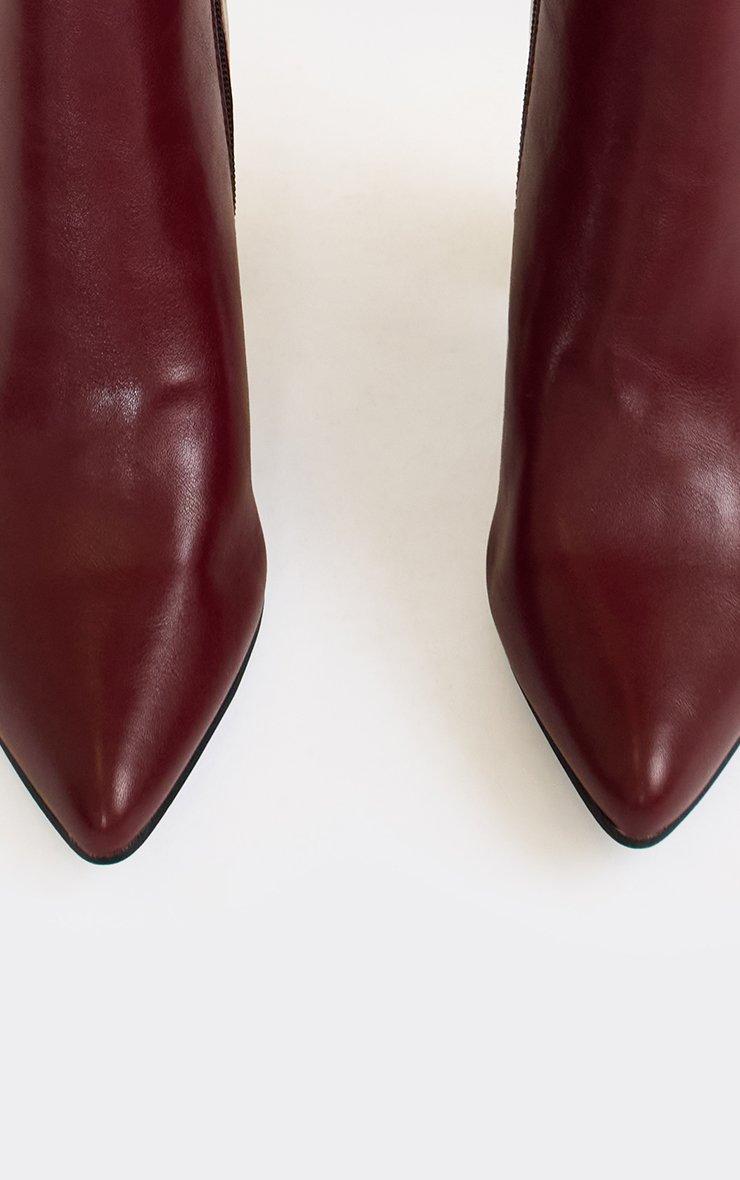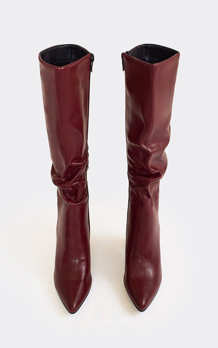 Rune Pointed Toe Knee High Slouched Heeled Boot In Burgundy Faux Leather