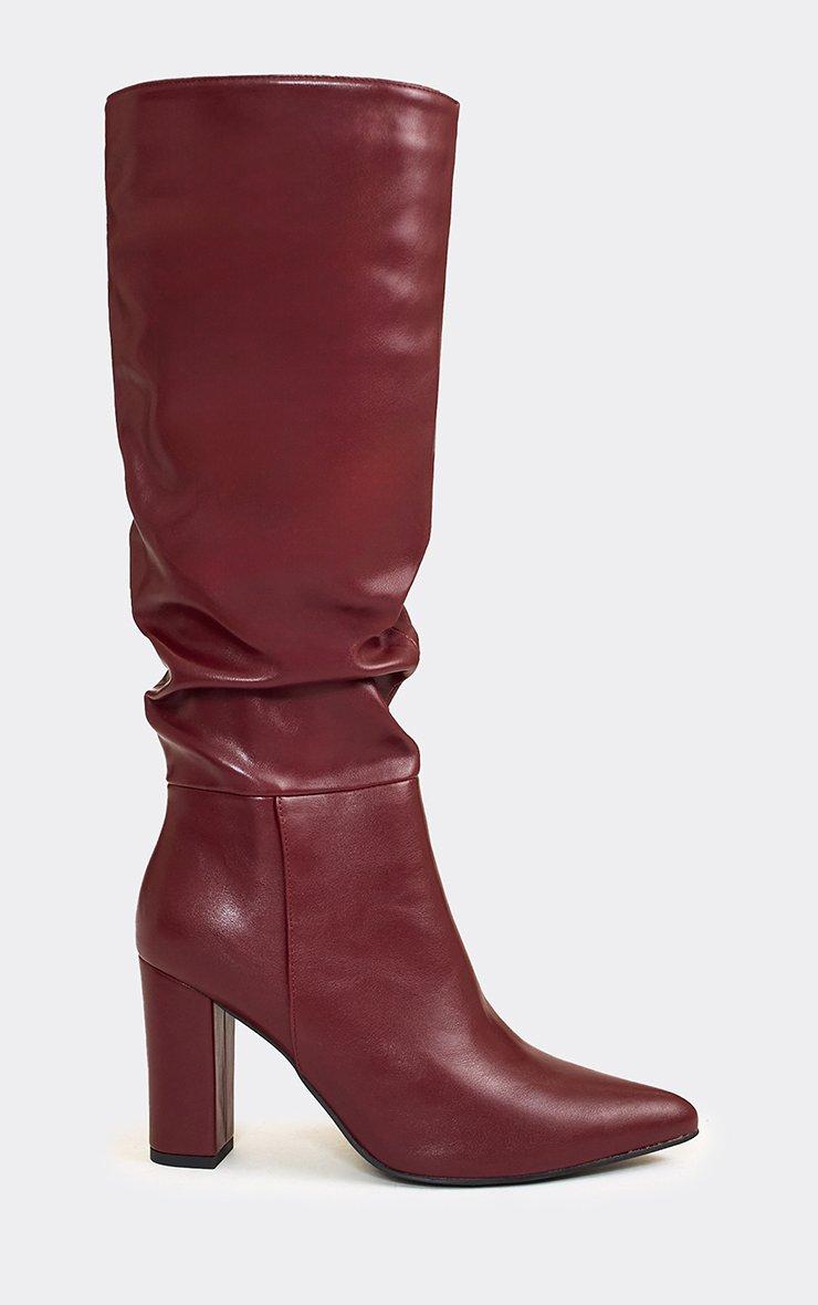 Turn heads, doll! In a burgundy colour, these knee high boots pop with pointed toe, slouched design, and heeled detailing for a chic, on-trend finish.
