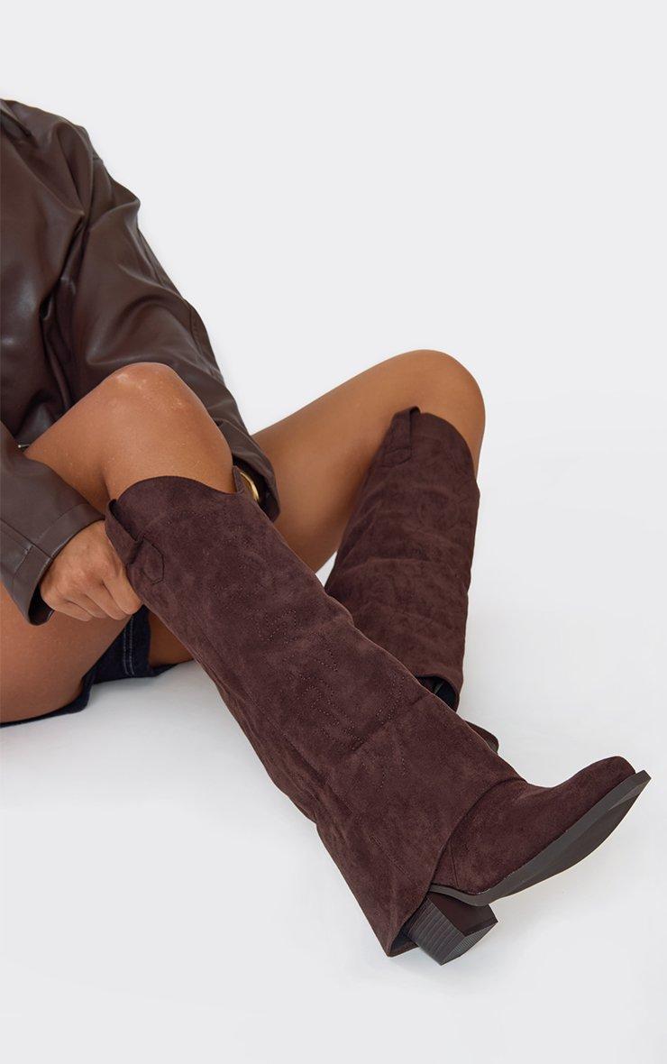 Parton Embroidered Layered Detail Knee High Long Western Cowboy Boot In Brown Faux Suede