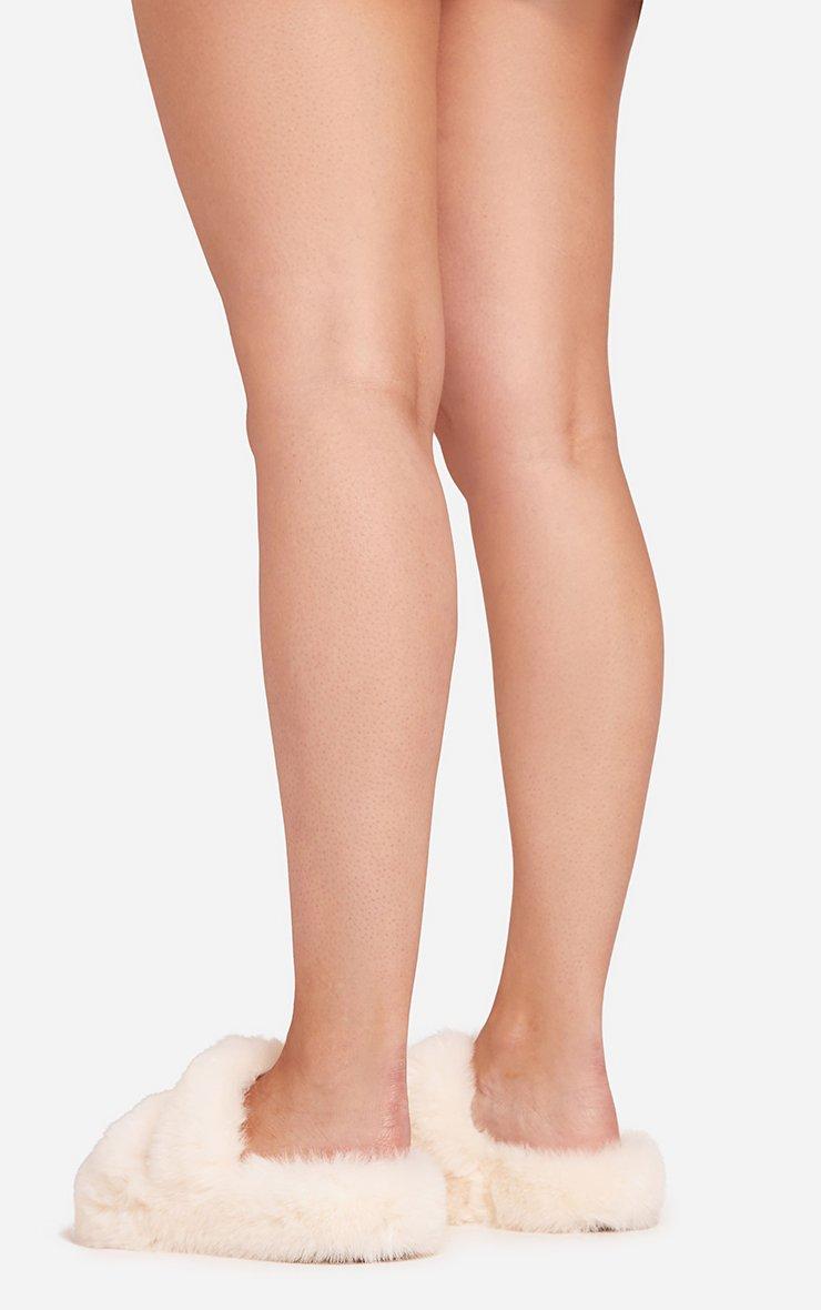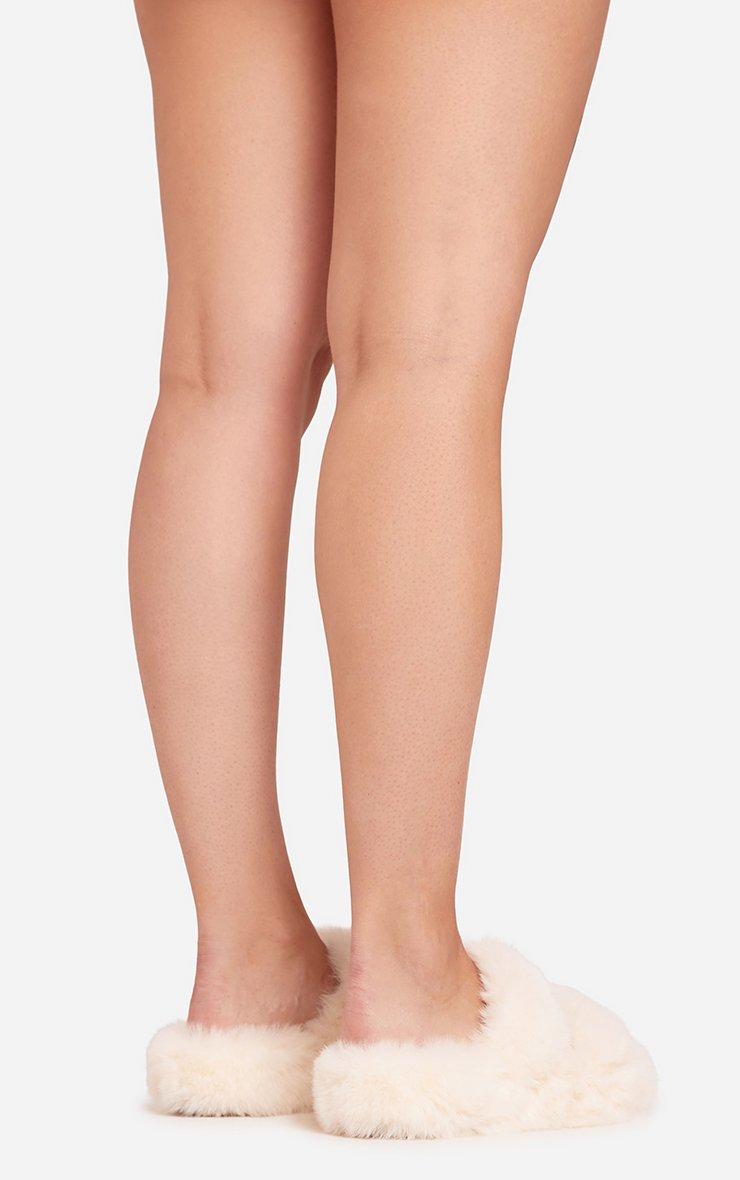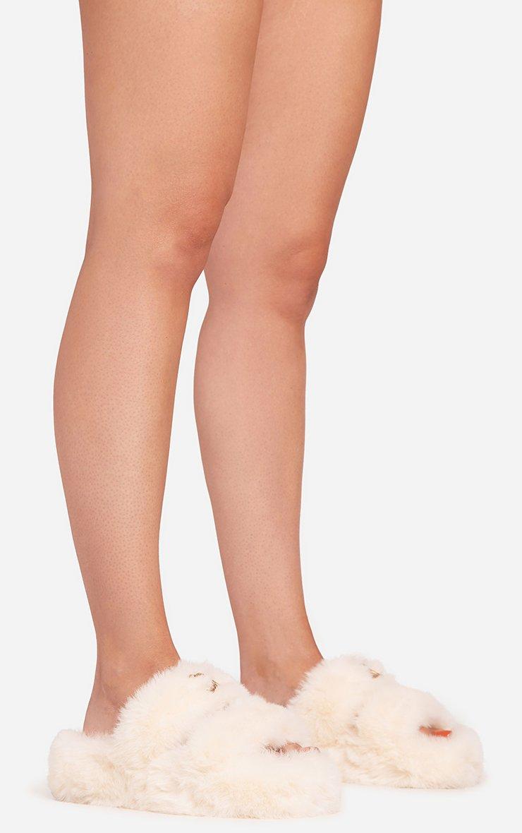 Slide into complete comfort with the cutest slippers around. Featuring a cream faux fur material, with logo detailing, a double strap and a flat slipper design.