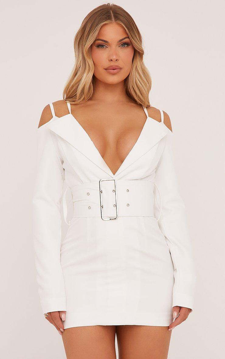 Strappy Off The Shoulder Plunge Belted Waist Blazer Dress In White