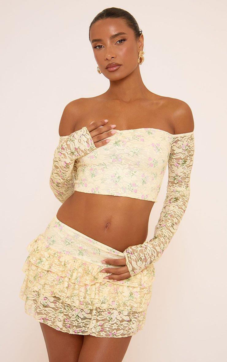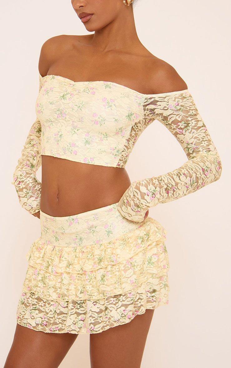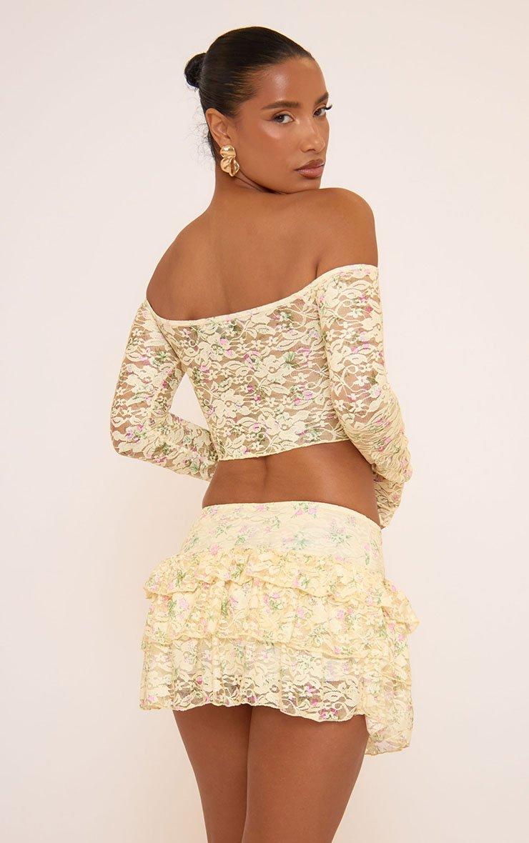 Serve soft glam with our Low Rise Frill Detail Layered Mini Skirt In Yellow Lace. This yellow lace mini skirt features frill layers and a low rise fit for a flirty, feminine feel. Style this lace mini skirt with the matching top for a head-turning look!