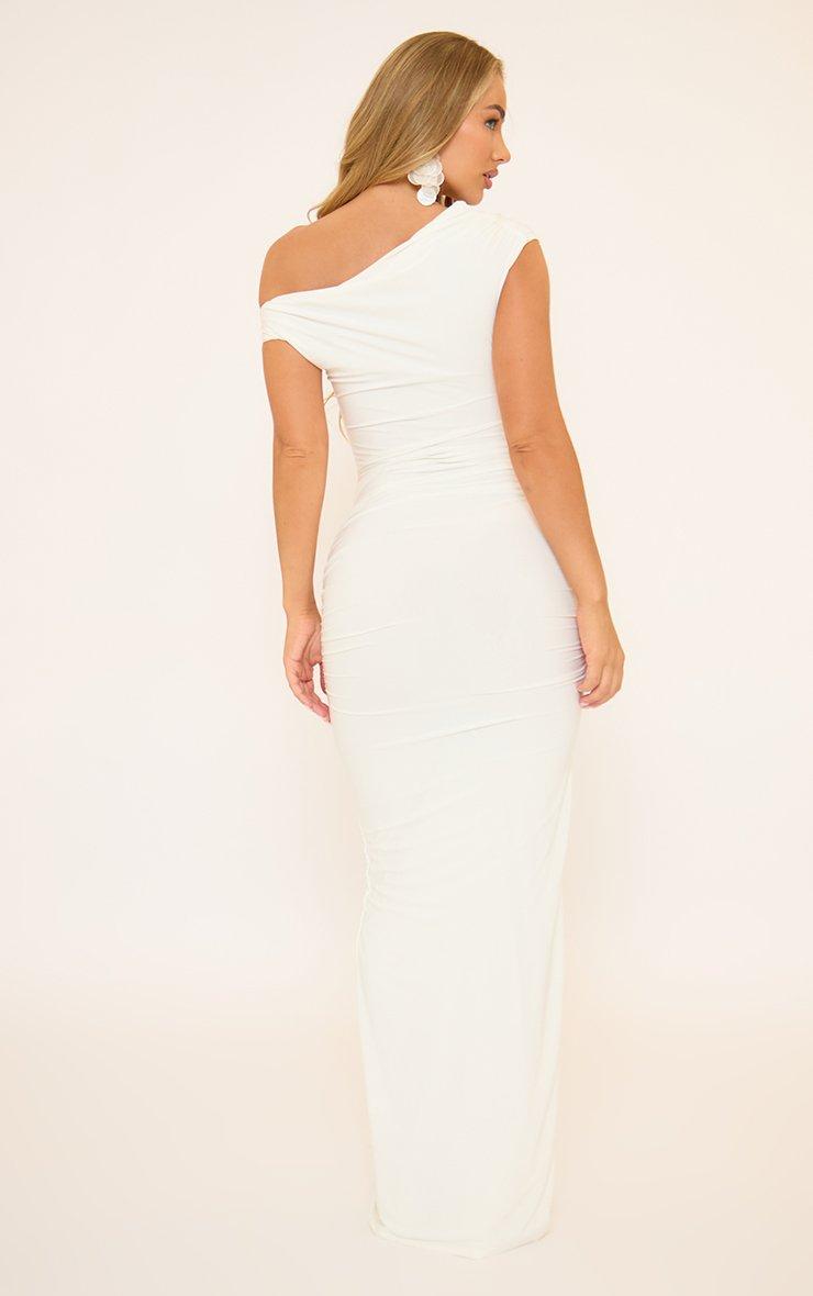 Make it a moment, doll! Featuring white slinky fabric with an asymmetric one shoulder fit and ruched detailing, this maxi dress serves sleek, chic energy perfect for standing out with serious attitude.