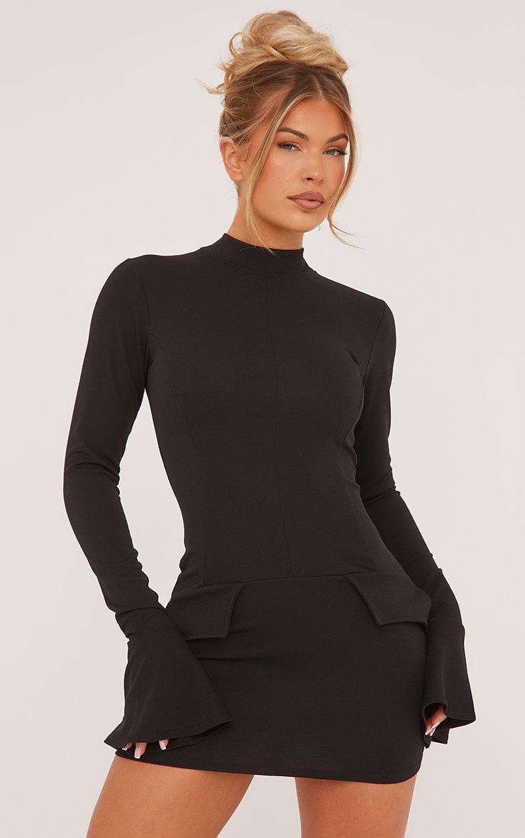 Get that chic effortless look with this dress doll. Featuring a black woven material, long sleeves, a high neck, a tailored design and a mini length.