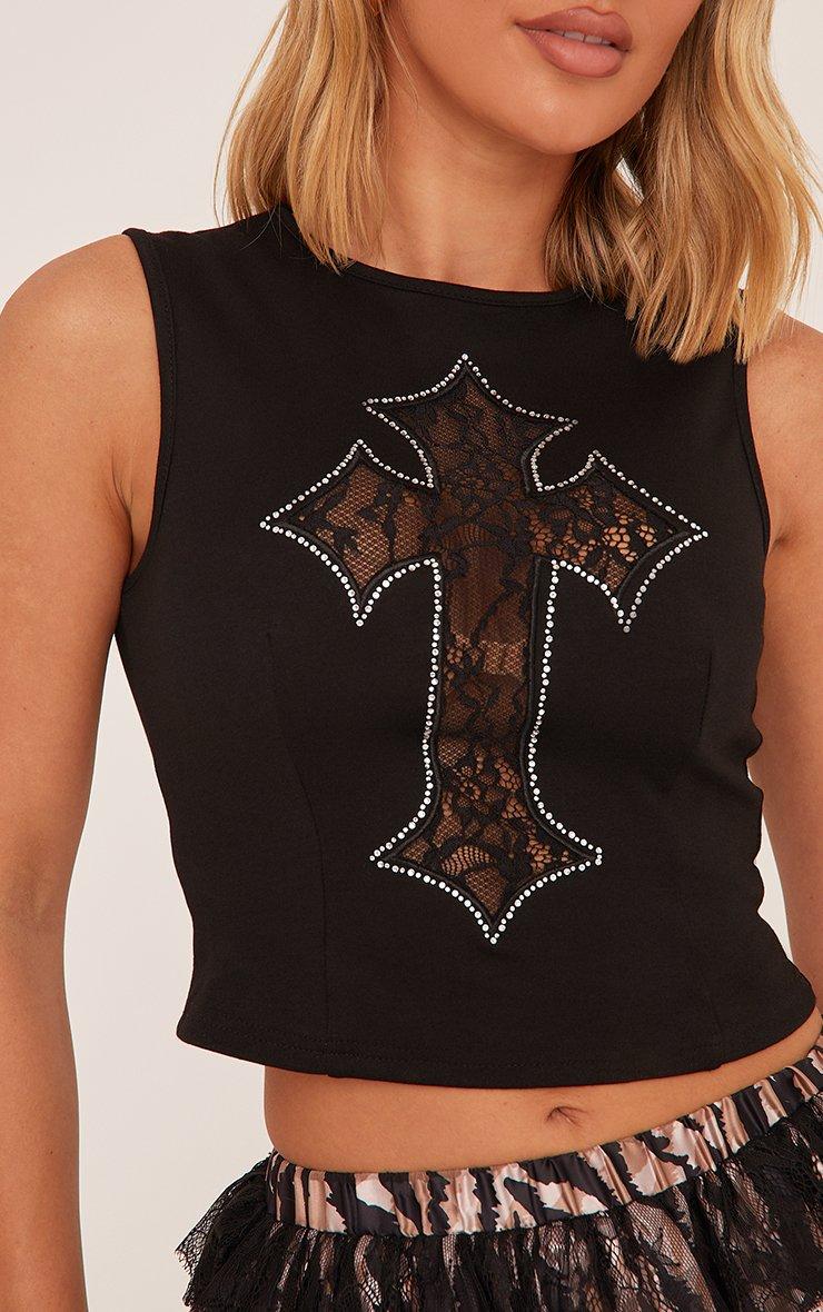 Diamante Lace Crucifix Detail Racer Top In Black