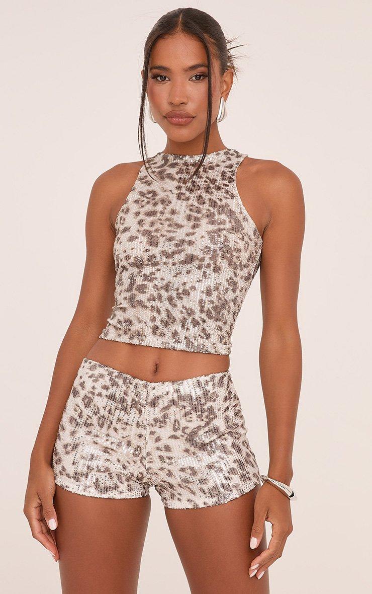 Demand attention in our High Neck Racer Crop Top In Leopard Print Sequin. This sequin leopard print top is fierce and flirty with its chic high neck and classic racer style. Pair this sequin top with the matching shorts for a dance floor approved vibe!