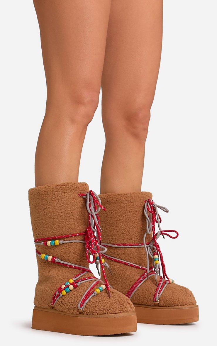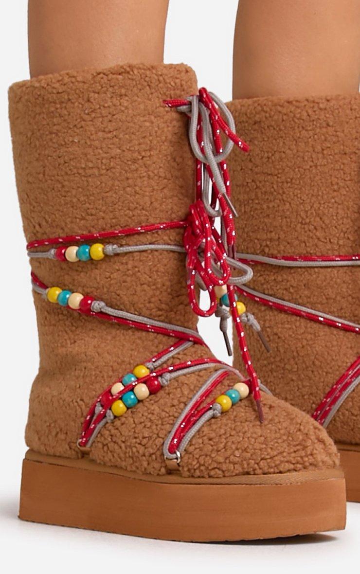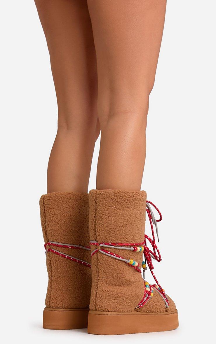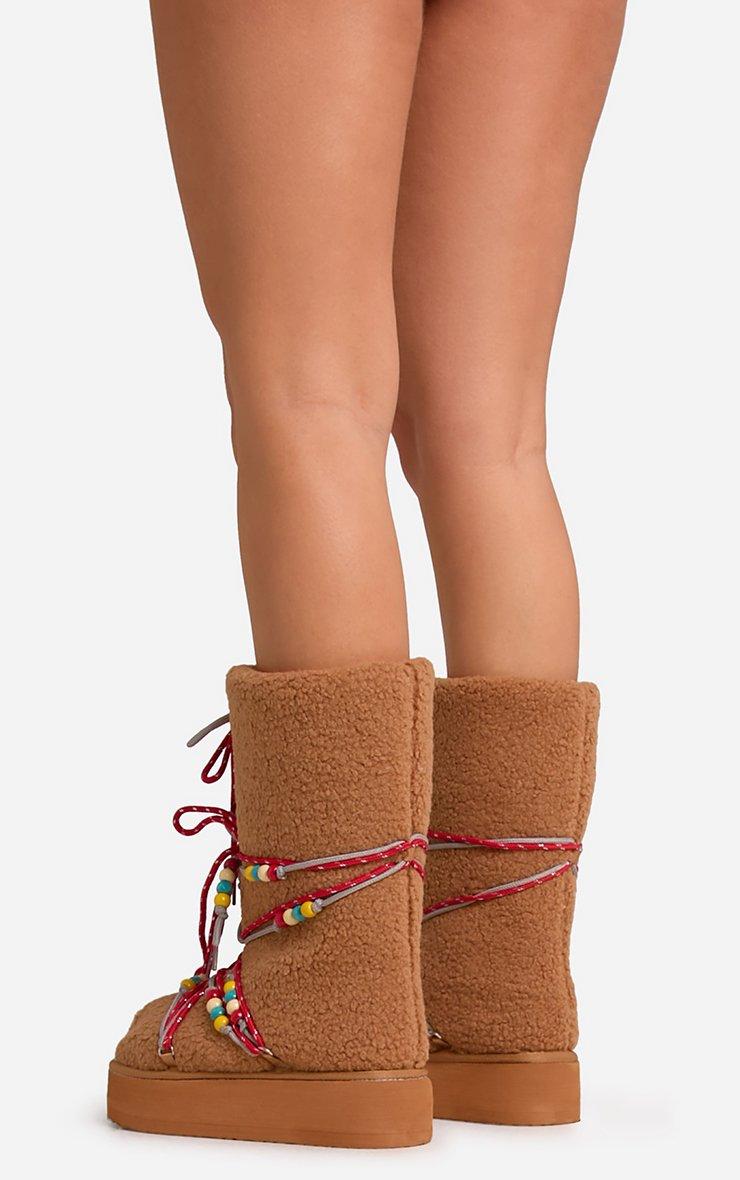 You’re gonna love our Tight-Ropes Strappy Bead Detail Platform Mid Calf Length Boot In Chestnut Faux Shearling. These shearling lace up boots feature strappy bead detailing and a platform sole for that perfect mix of boho chic and comfort. Trust us, these calf boots are ideal for turning heads while staying cosy all season long.
