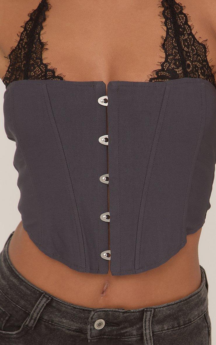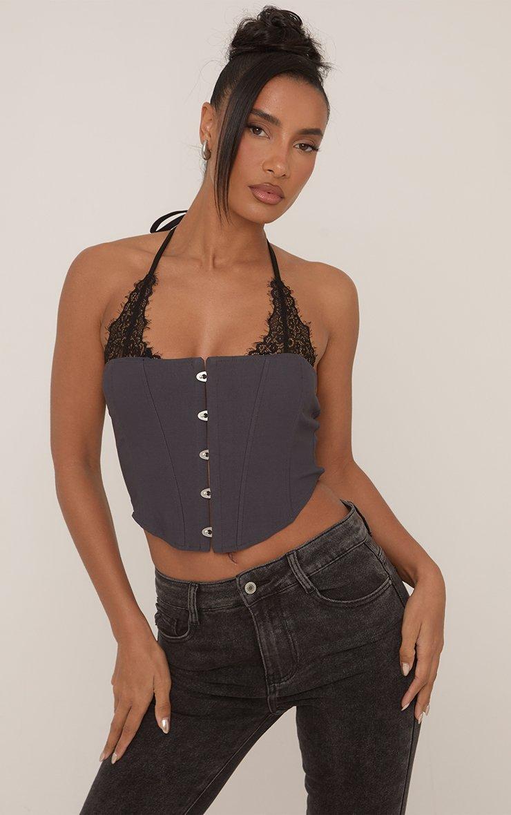 Lace Halterneck Hood And Eye Front Corset Top In Grey