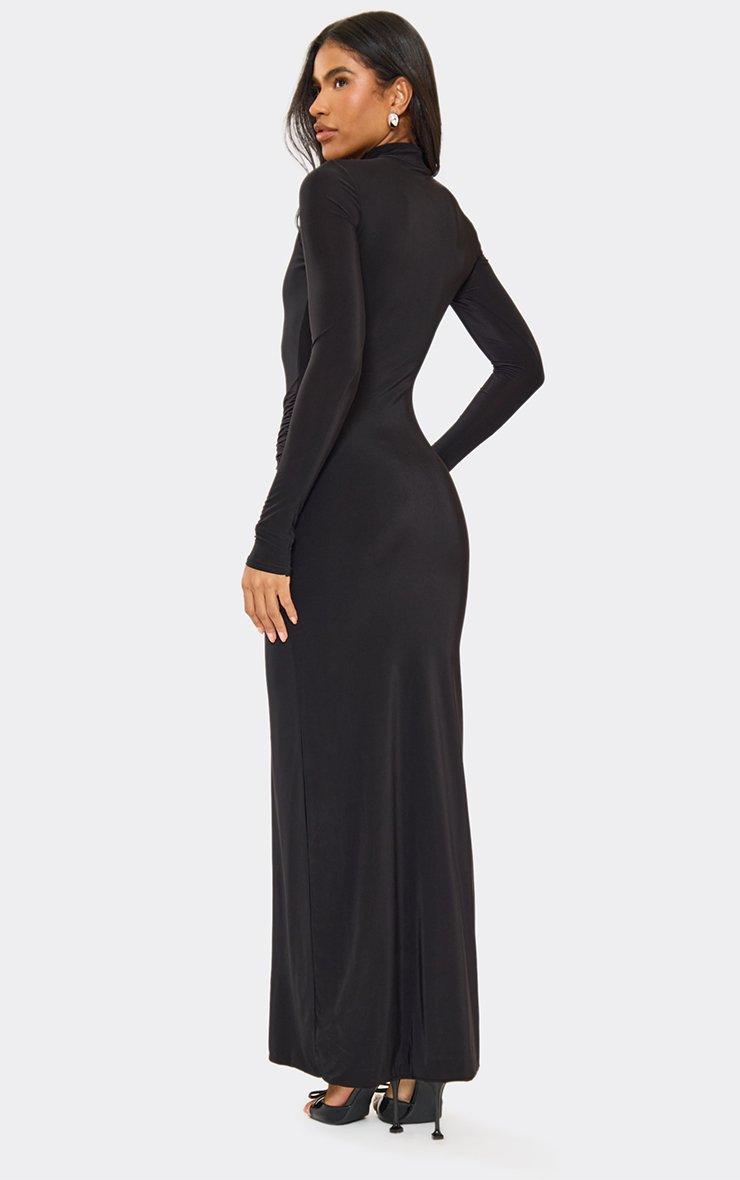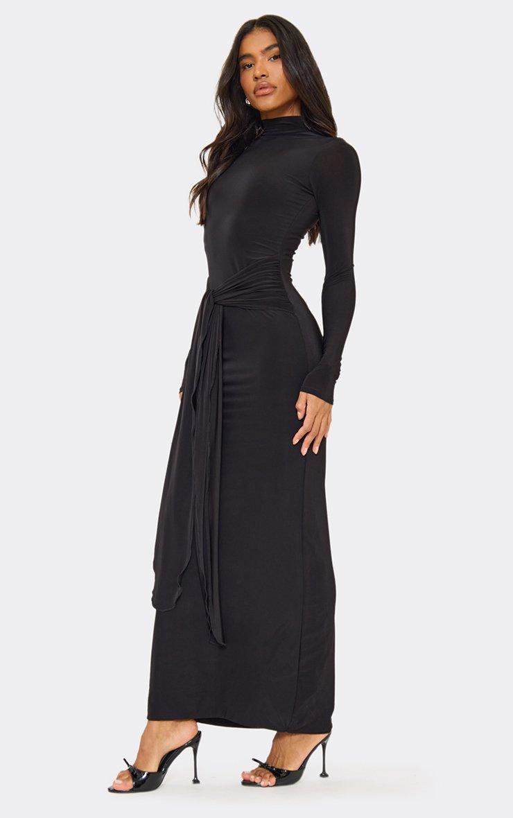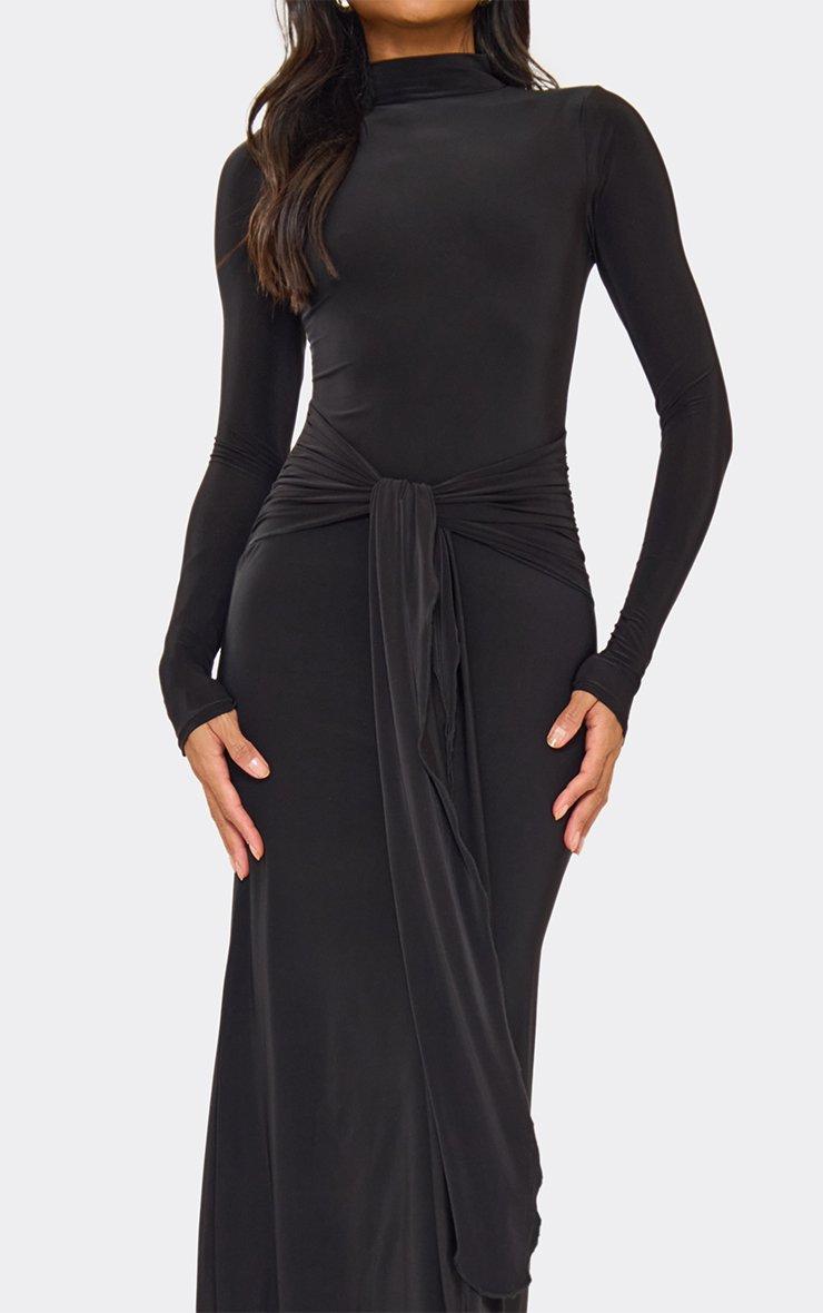 Long Sleeve High Neck Drape Detail Maxi Dress In Black Slinky In Black