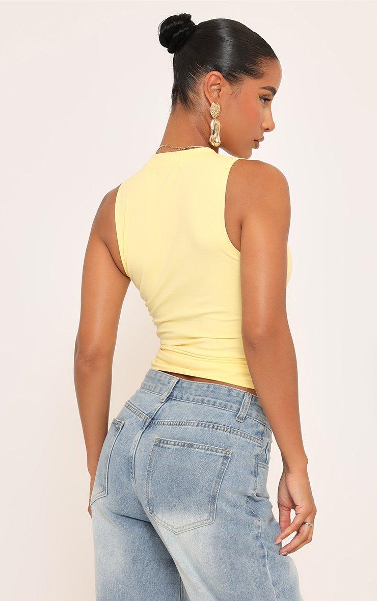 Brighten up, doll. Featuring soft yellow fabric with scoop neck and stud detailing, this vest top serves bold vibes and fresh energy—perfect to make your outfit pop with attitude.
