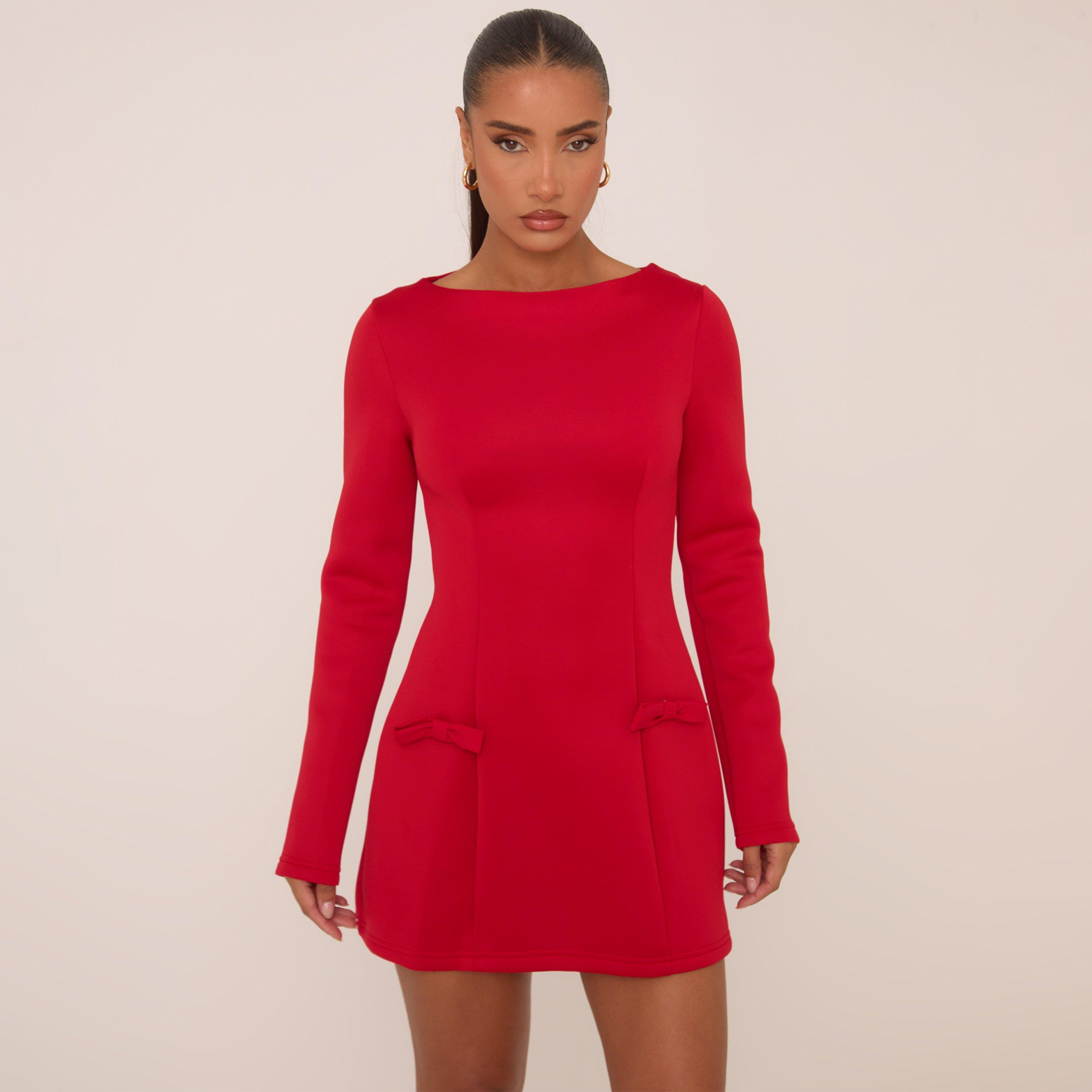 Long Sleeve Bow Detail A Line Mini Dress In Red
