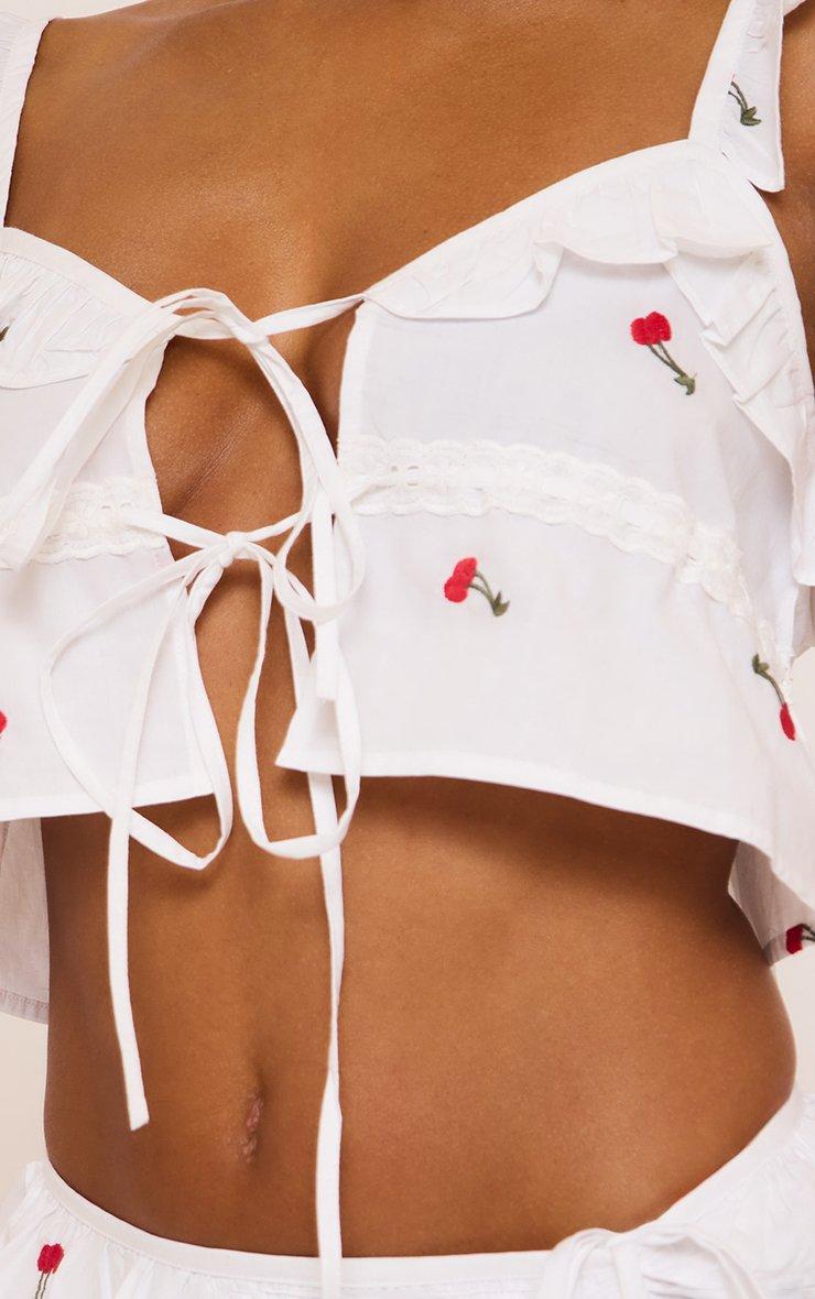 Sleeveless Tie Front Embroidered Cherry Frill Top In White