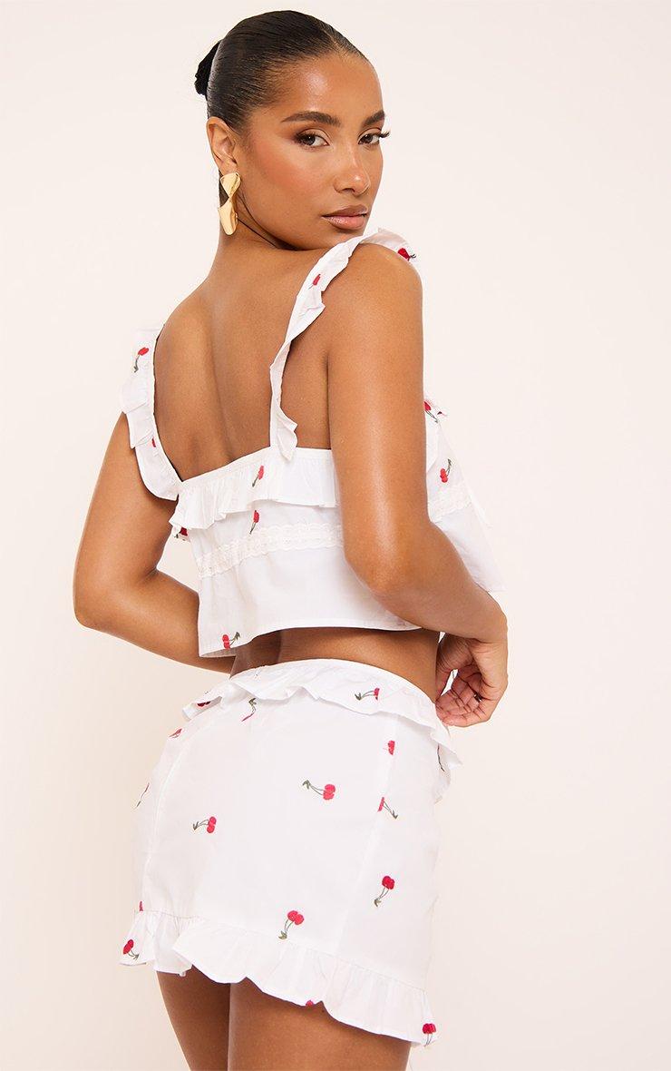 Made for sunny days and cute cafe hangs, featuring a white material with tie front, embroidered cherry and frill detailing—this sleeveless top serves fresh vibes with a cheeky twist, doll. Too sweet to handle.