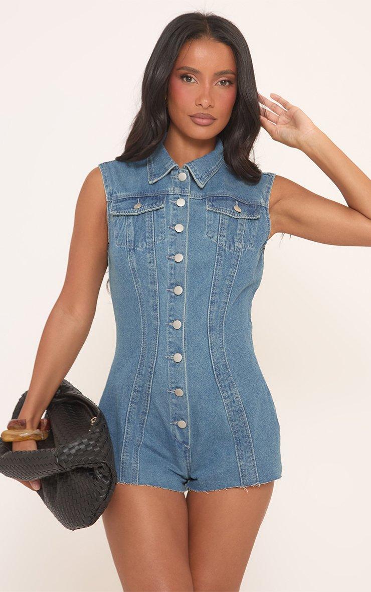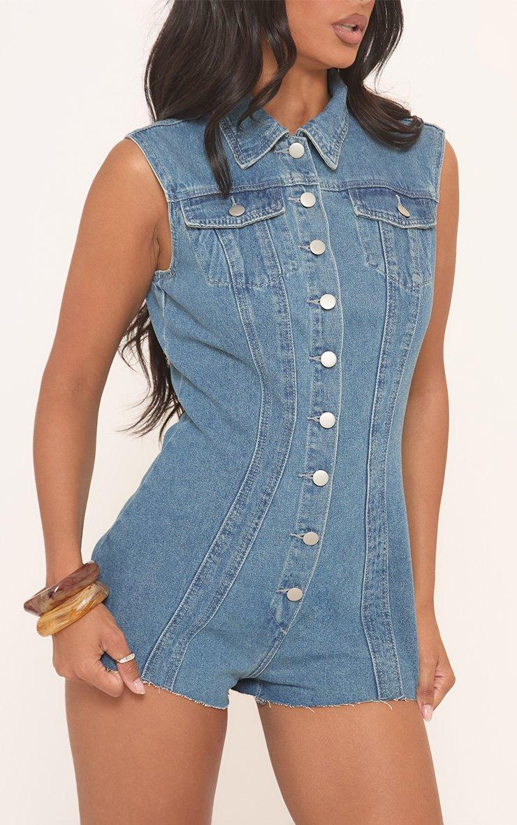 Sleeveless Cinched Waist Detail Button Down Playsuit In Blue Denim