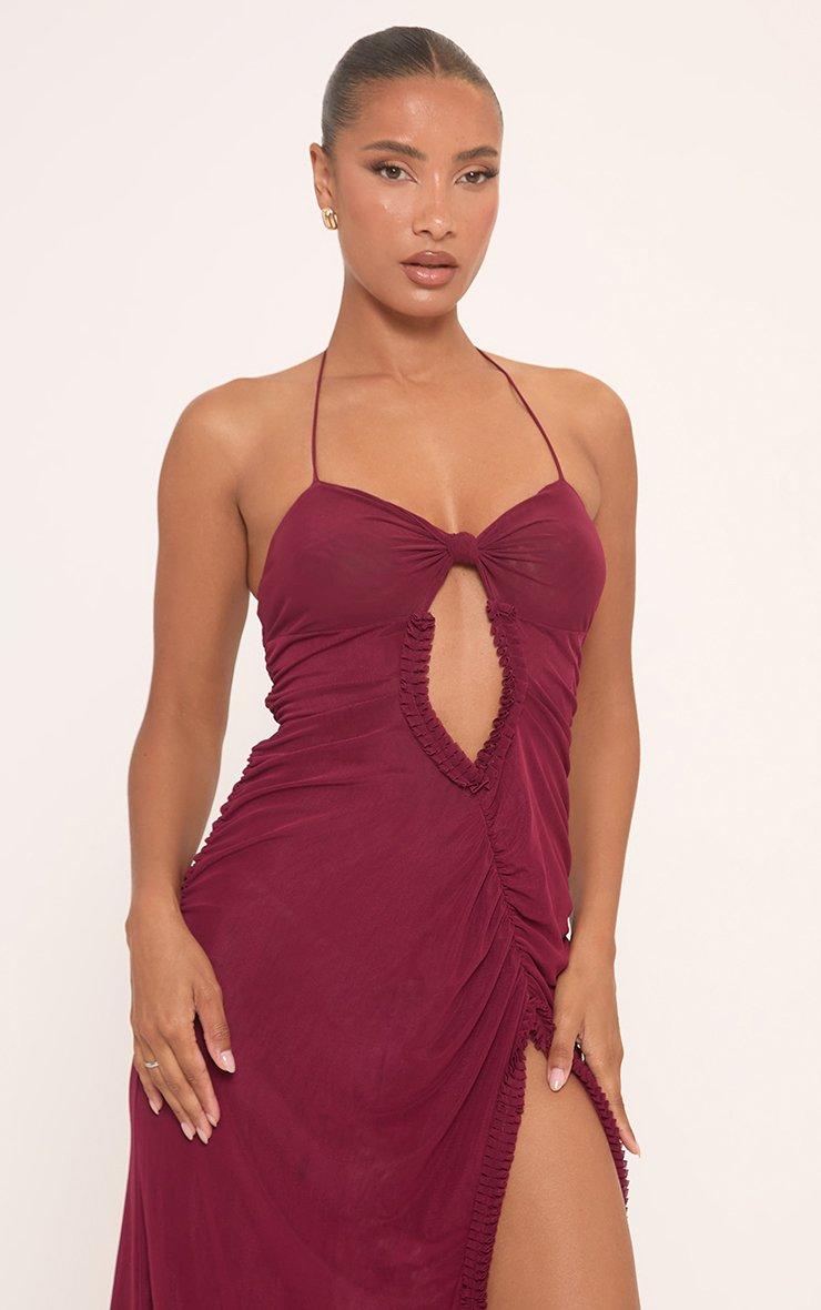 Got a night to impress, doll? Featuring rich burgundy fabric with knotted, frilled front and daring cut-out detailing, this halterneck maxi dress brings all the drama with a split hem that moves with you.