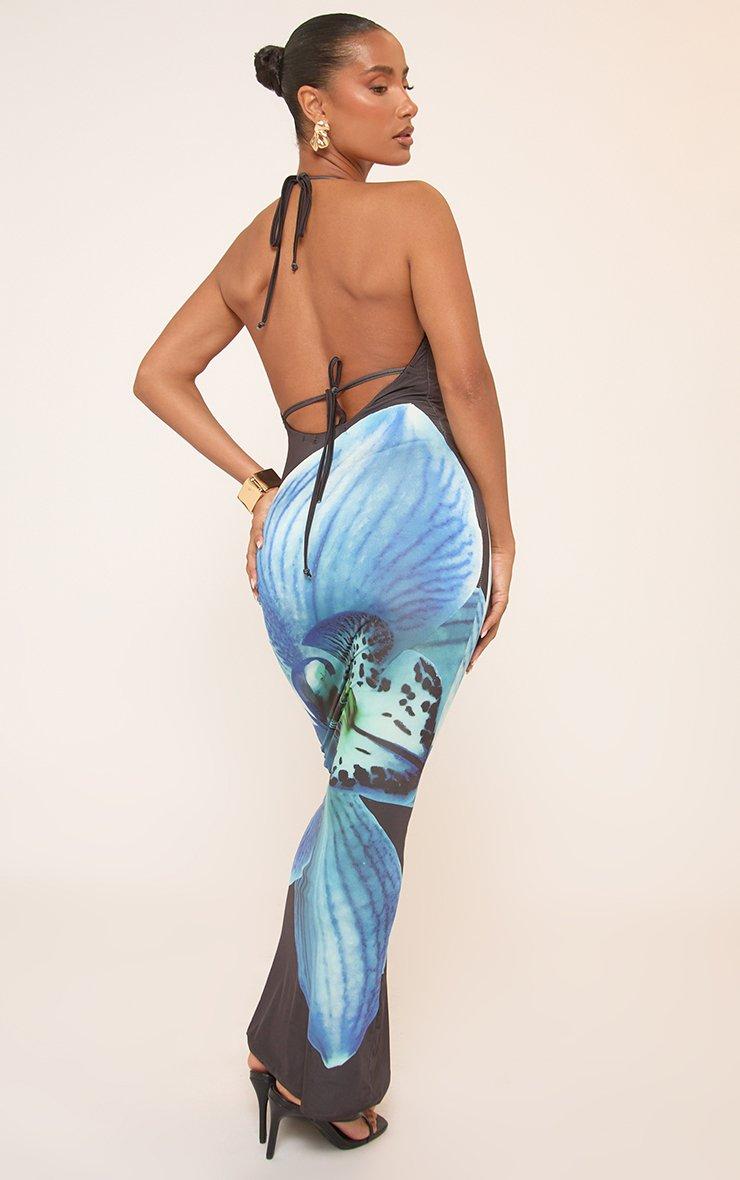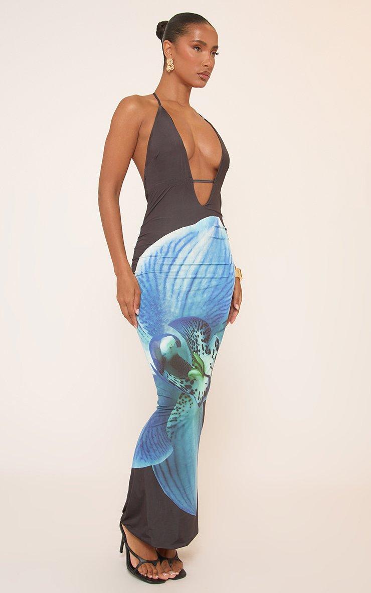 Plunge Hatlerneck Open Back Maxi Dress In Blue Floral Print