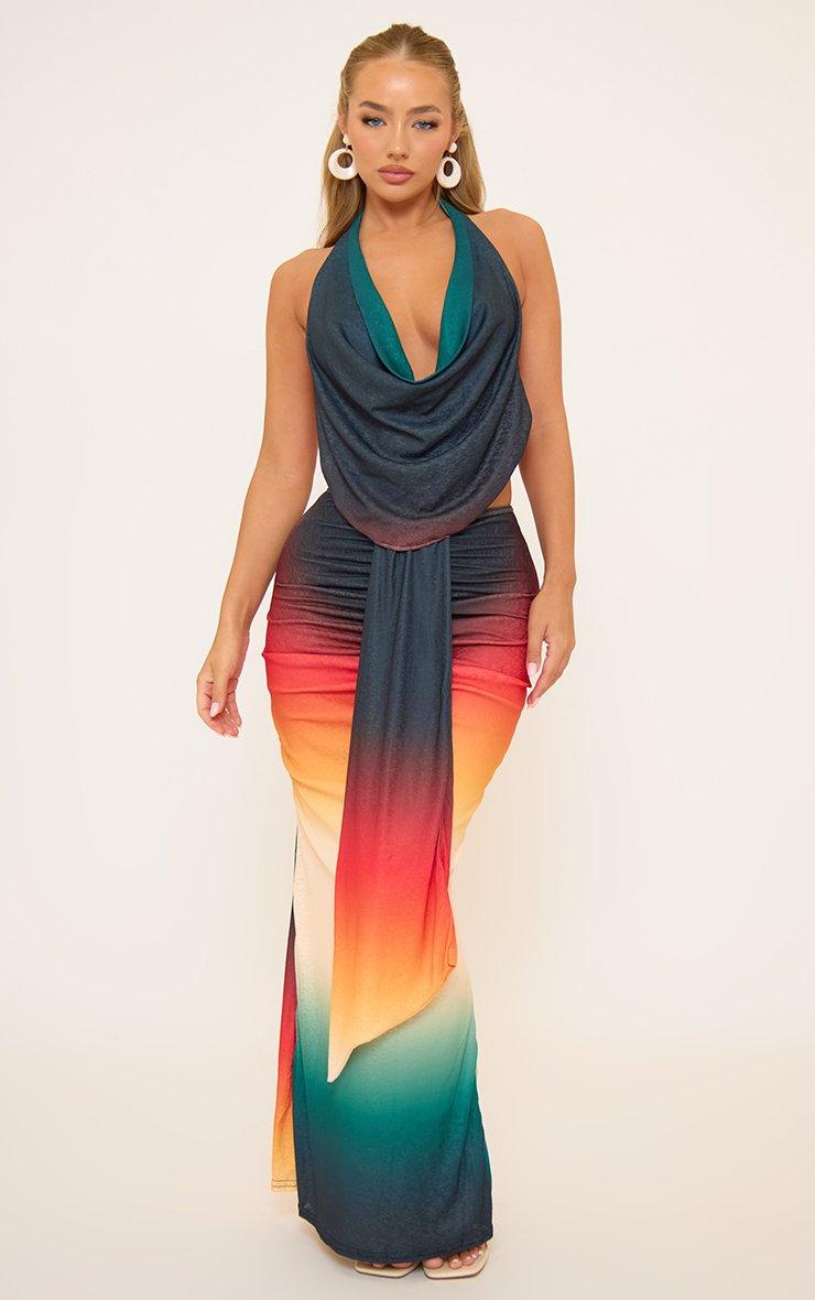 We're calling it, this multicoloured maxi skirt is the statement piece that's going to take your Coachella festival outfits. Featuring a mix of vibrant prints and sheer mesh fabric, this skirt adds a playful twist to anything you pair it with. Here to up the drama and flatter the figure, this skirt's low waist fit sculpts your silhouette, while the draped front detail flows and moves with your every step. Perfect for sunset-to-sunrise dancing, this lightweight and breathable maxi skirt brings that effortlessly cool vibe to any of your Coachella festival outfits. Key Features Low-rise Drape front detail Maxi length Mermaid style Multicoloured, ombre design Styling Notes Finally going to Coachella? Make the skirt the moment by pairing this multicoloured maxi skirt with a bralette , ankle boots , a cross-body bag, gold earrings , and beachy, mermaid waves. Off to a romantic beachfront dinner with bae? Go for a matching top , stiletto heel, and wavy hair in a half-up-half-down hairstyle.
