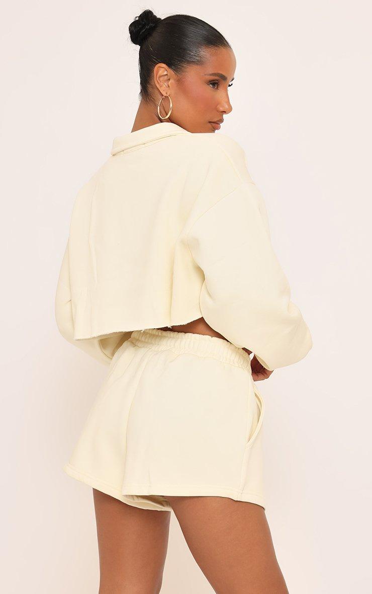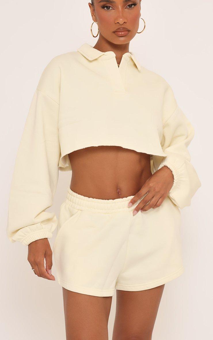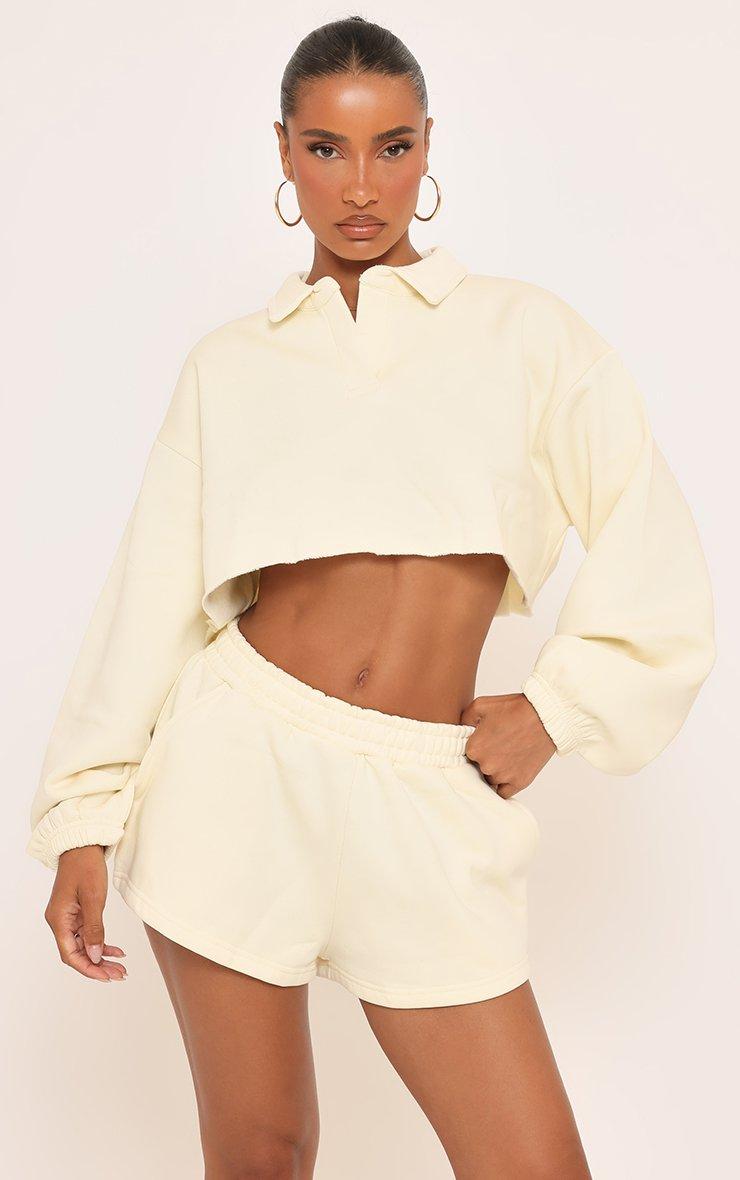 Long Sleeve Polo Collar Detail Cropped Sweatshirt In Cream