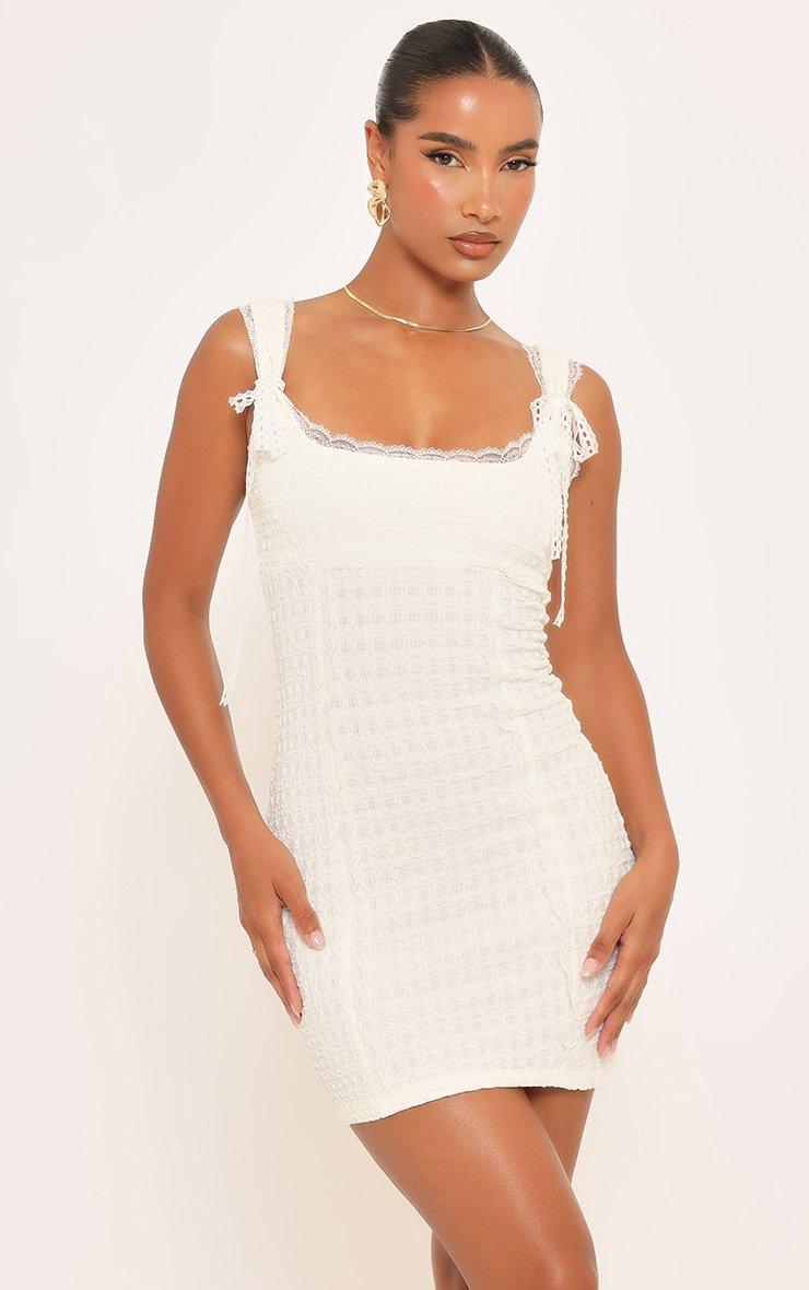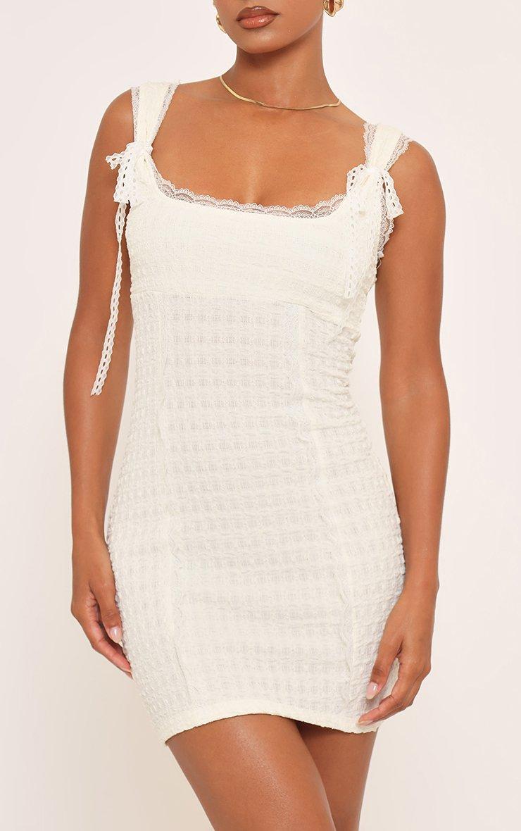 Square Neck Lace Trim Detail Mini Dress In Cream Texture